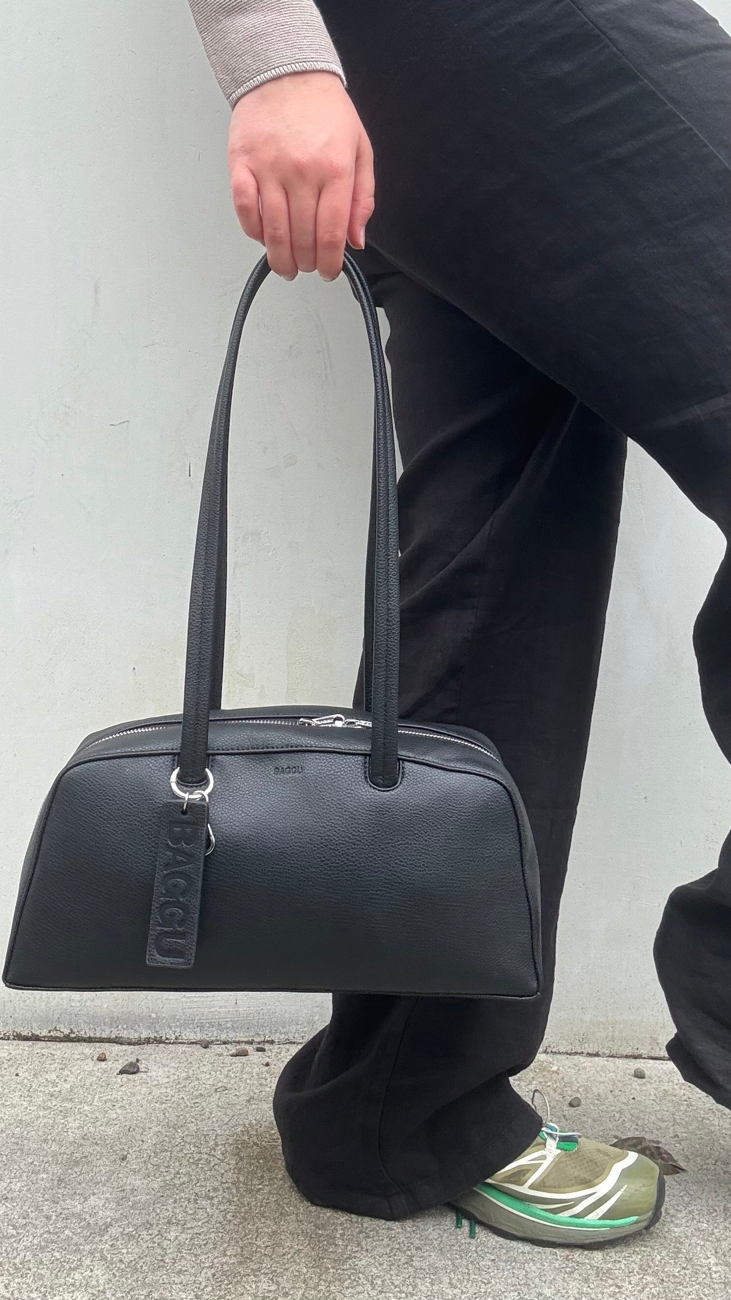 A recycled leather bowler bag designed to be accessorized, with four charm loops and a clip ring. An interior zip pocket keeps things secure and in reach. Extra room fits your book, phone, wallet, keys, and more.