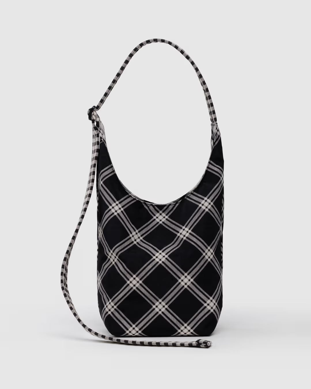 A slouchy, softly structured nylon bag with an adjustable strap. Interior zip pocket with a magnetic closure.