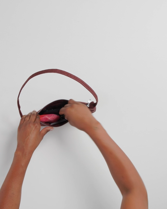 A sleek, compact bag featuring built-in card slots for organization, metal charm, and adjustable strap.