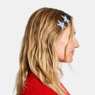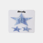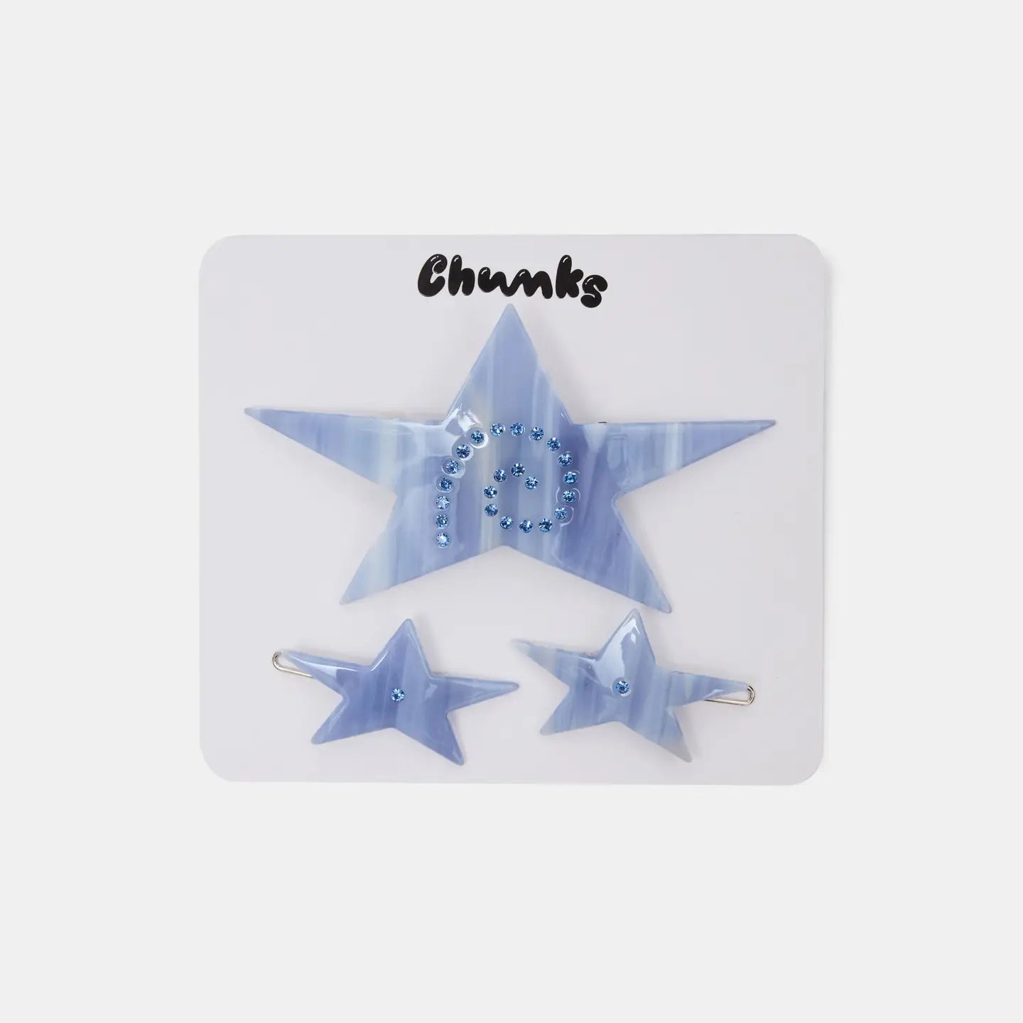 A 3 pack of denim blue colored star clips, studded with blue rhinestones. Two small ball-and-clasp clips and one large french barrette clip. Made from high quality acetate; a durable, plant based bio-plastic. Metal hardware is lead and nickel-free. Slight variations will appear with pattern, color and form due to the handmade nature of the product. Large star clip measures approx 4.25" W x 2.5" H x 0.5" D Small star clip measures approx 2" W x 1.25" H x 0.25" D Color: light blue, silver tone hardware