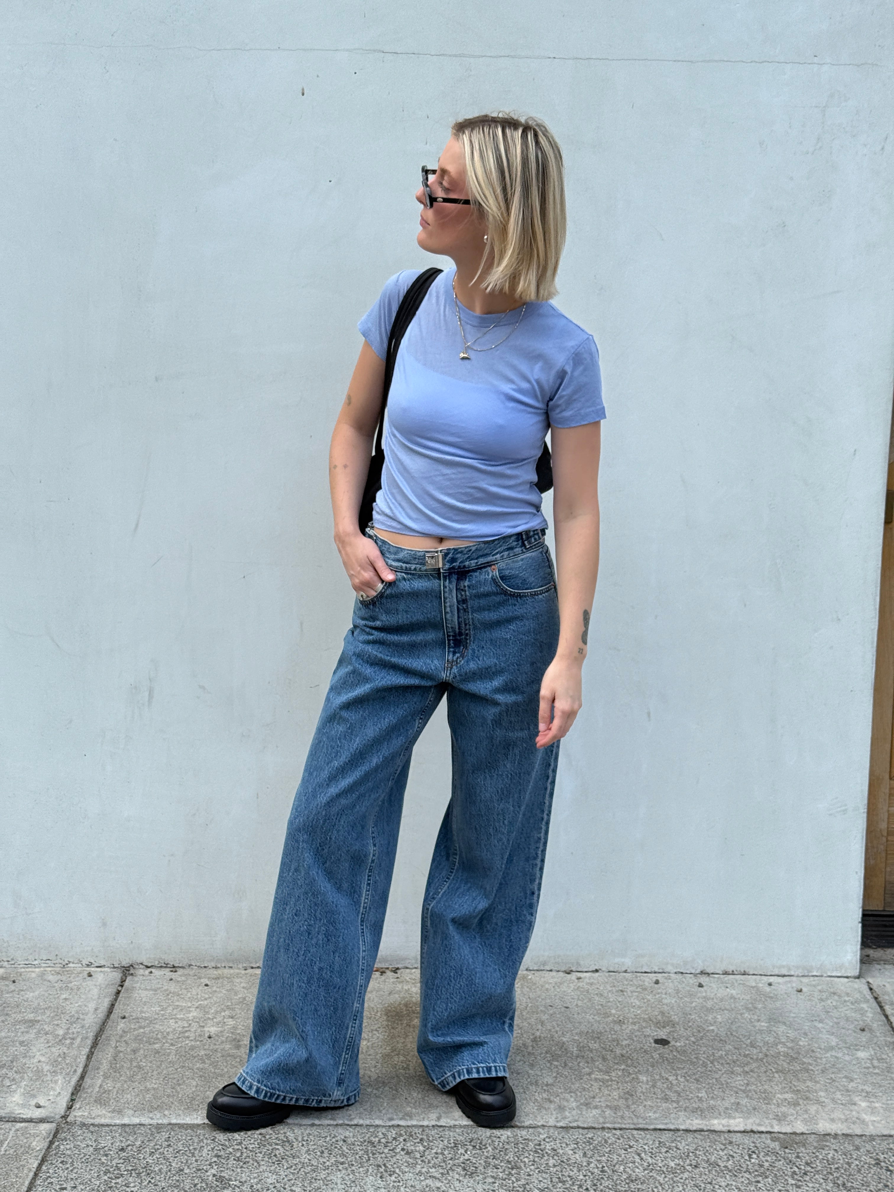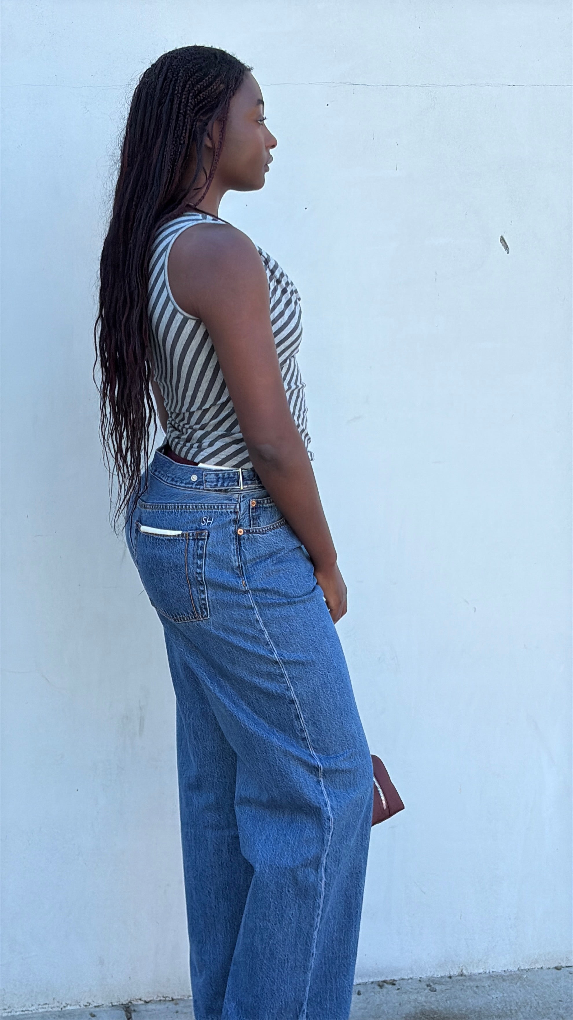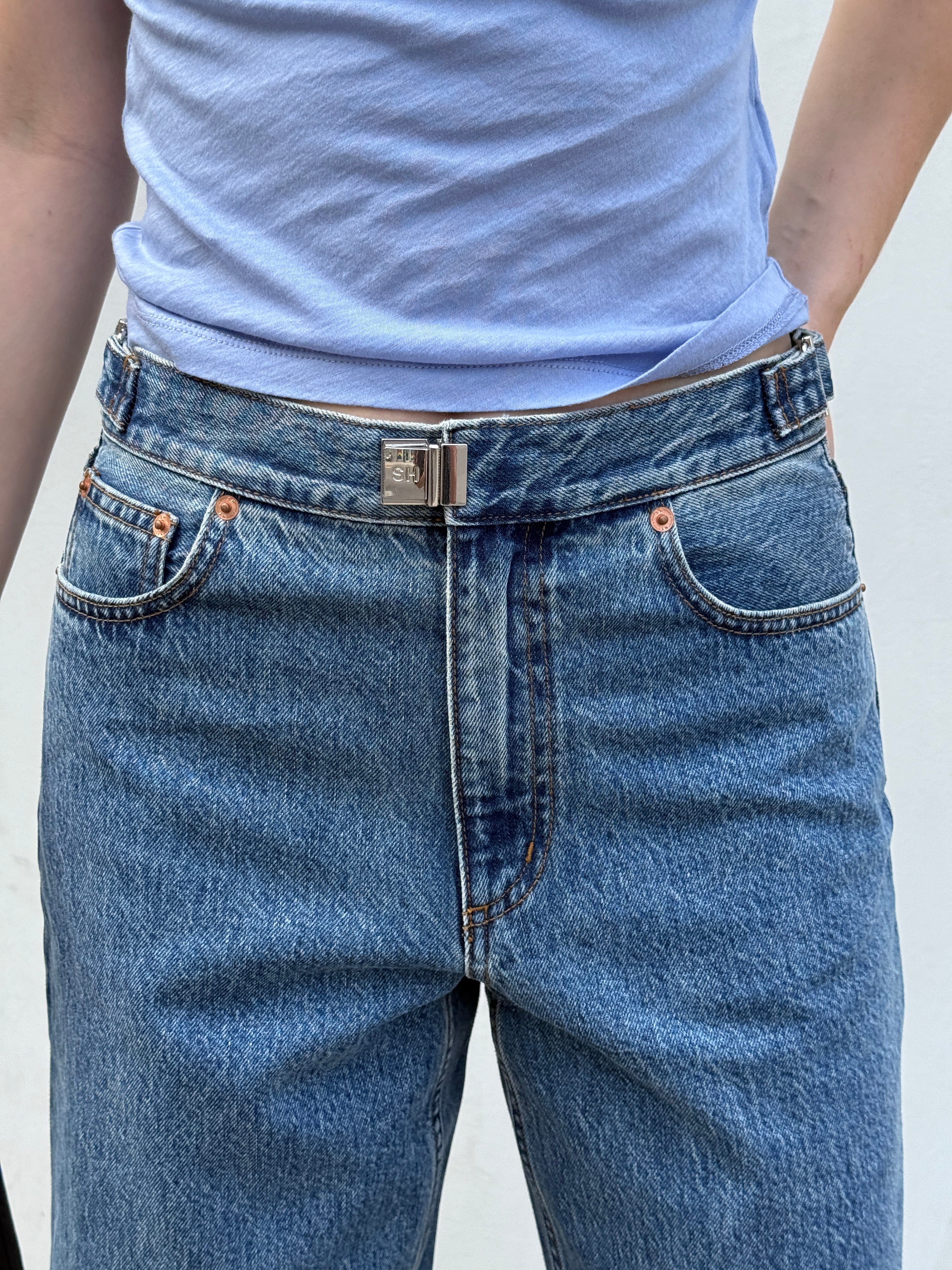 The Buckle jean is a relaxed leg, subtle drop-crotch with a 31" inseam. It features Still Here custom chrome buckle hardware and adjustable waistband side fasteners, allowing it to be worn as both a mid or low-rise jean.