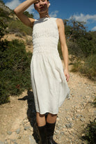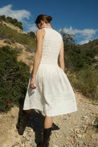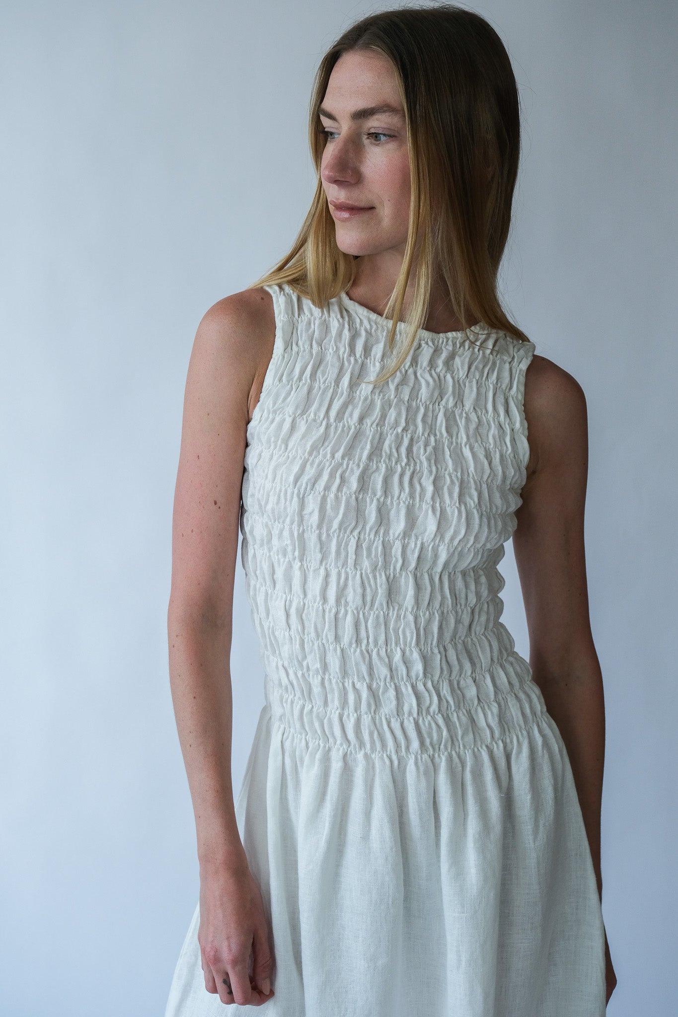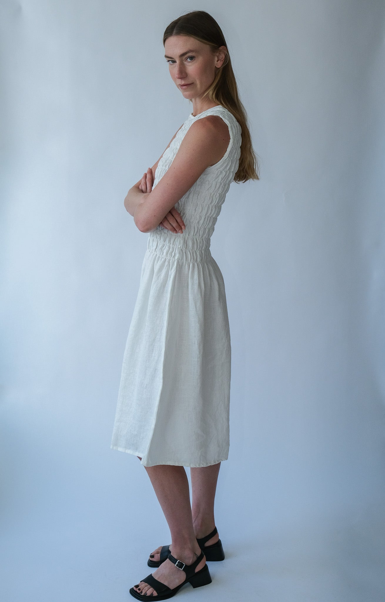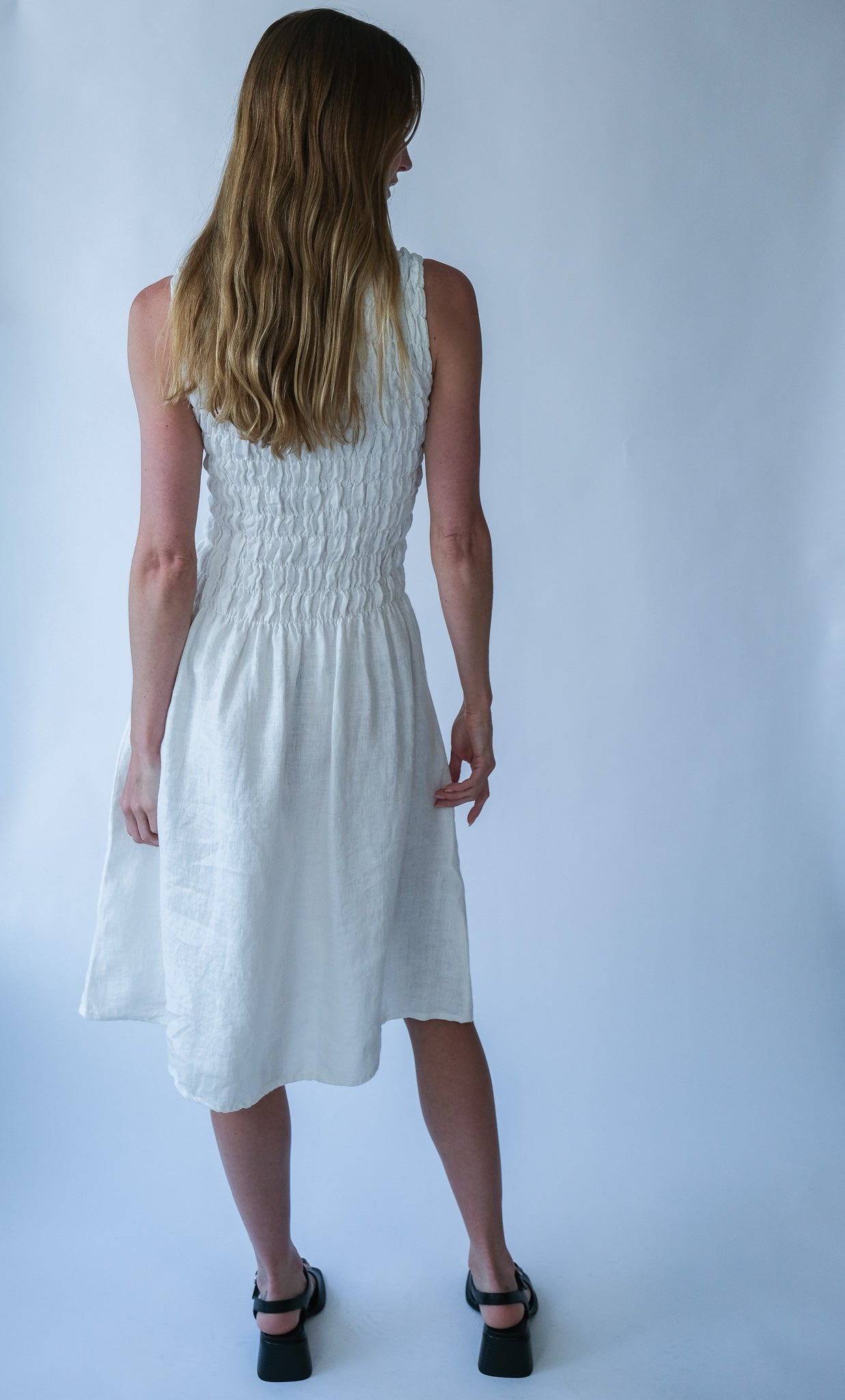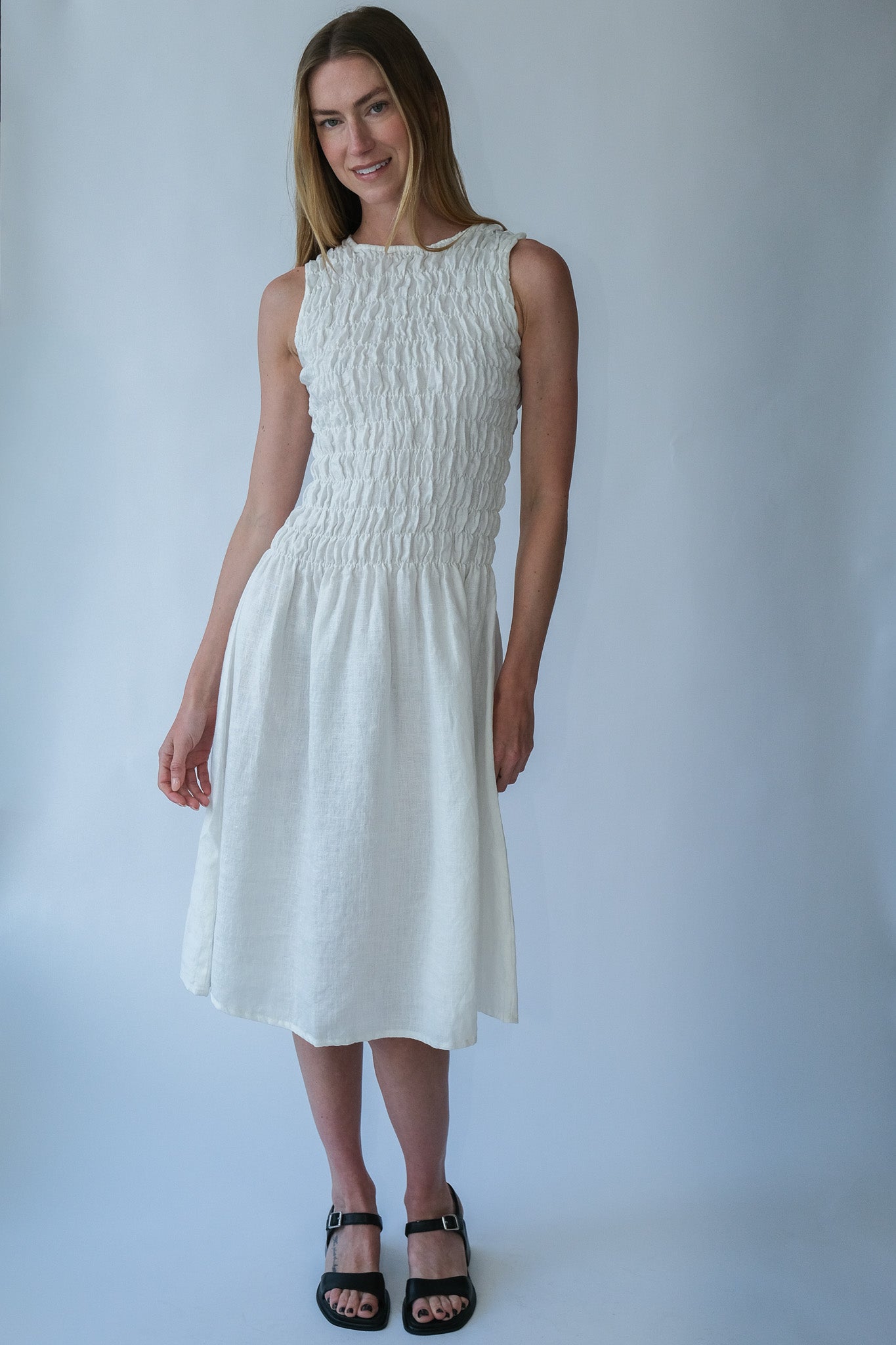 The Emilija smocked midi dress is defined by its elasticated bodice that creates a flexible yet structured fit. The smocking gently shapes the upper body while allowing natural movement and comfort throughout the day.