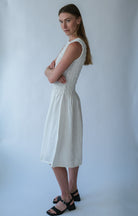A high boat neckline adds clean architectural lines, while the midi-length A-line skirt flows softly from the waist. The absence of pockets enhances the streamlined silhouette and keeps the design minimal.