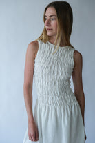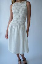 This smocked midi dress offers a balanced combination of structure and fluidity, making it suitable for everyday wear and refined occasions.