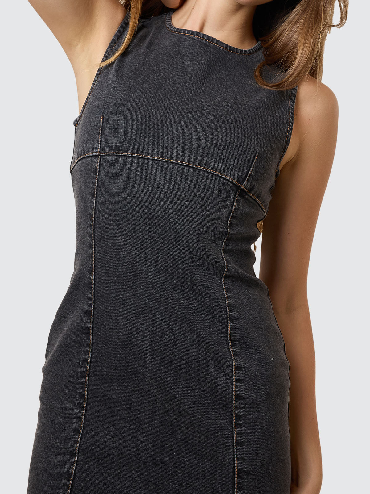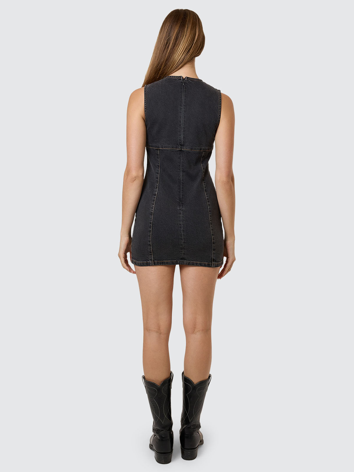 The Night Shift Mini Dress in Ash Black is a fitted denim tank dress featuring a zipper up the back.