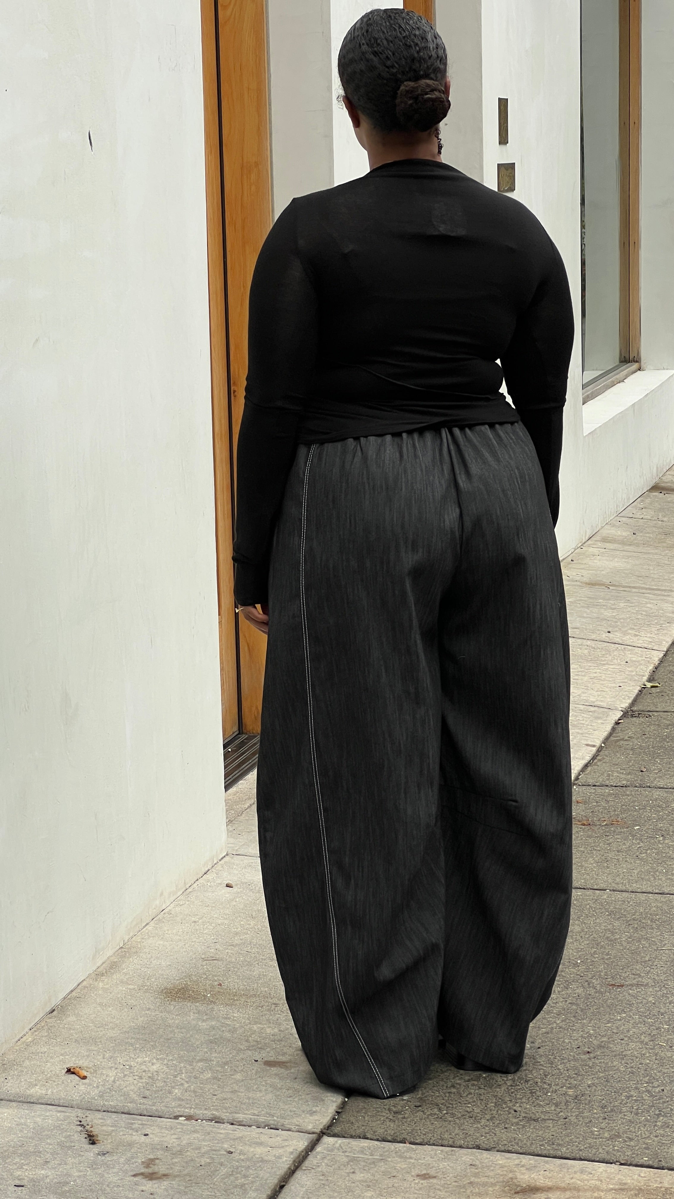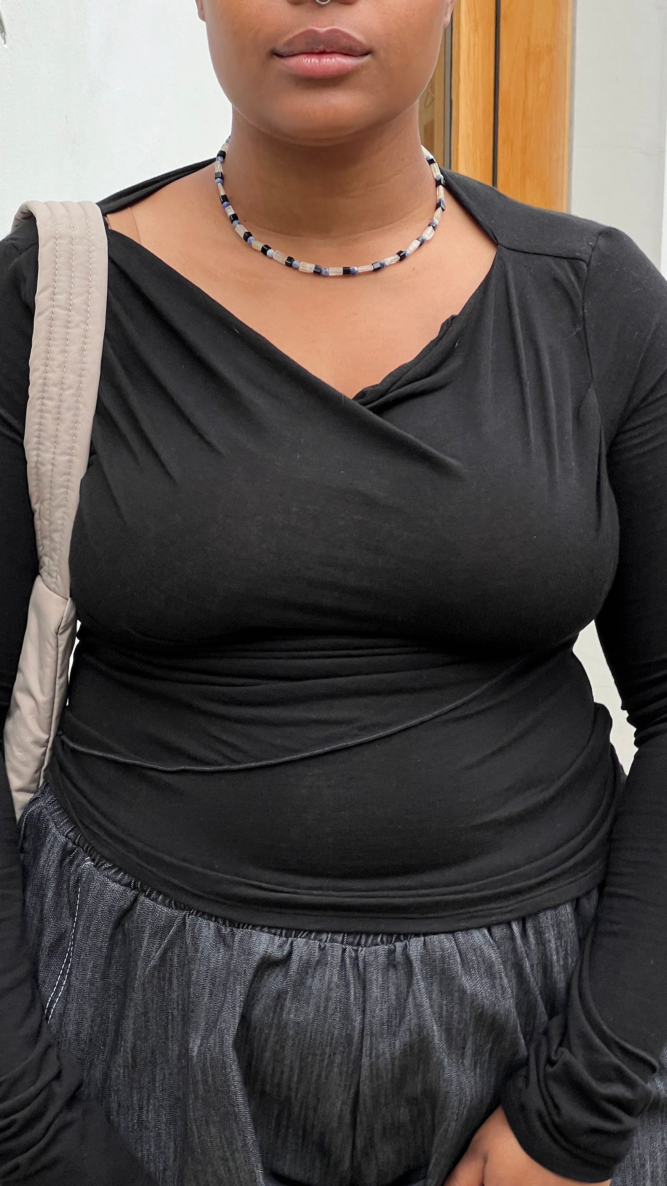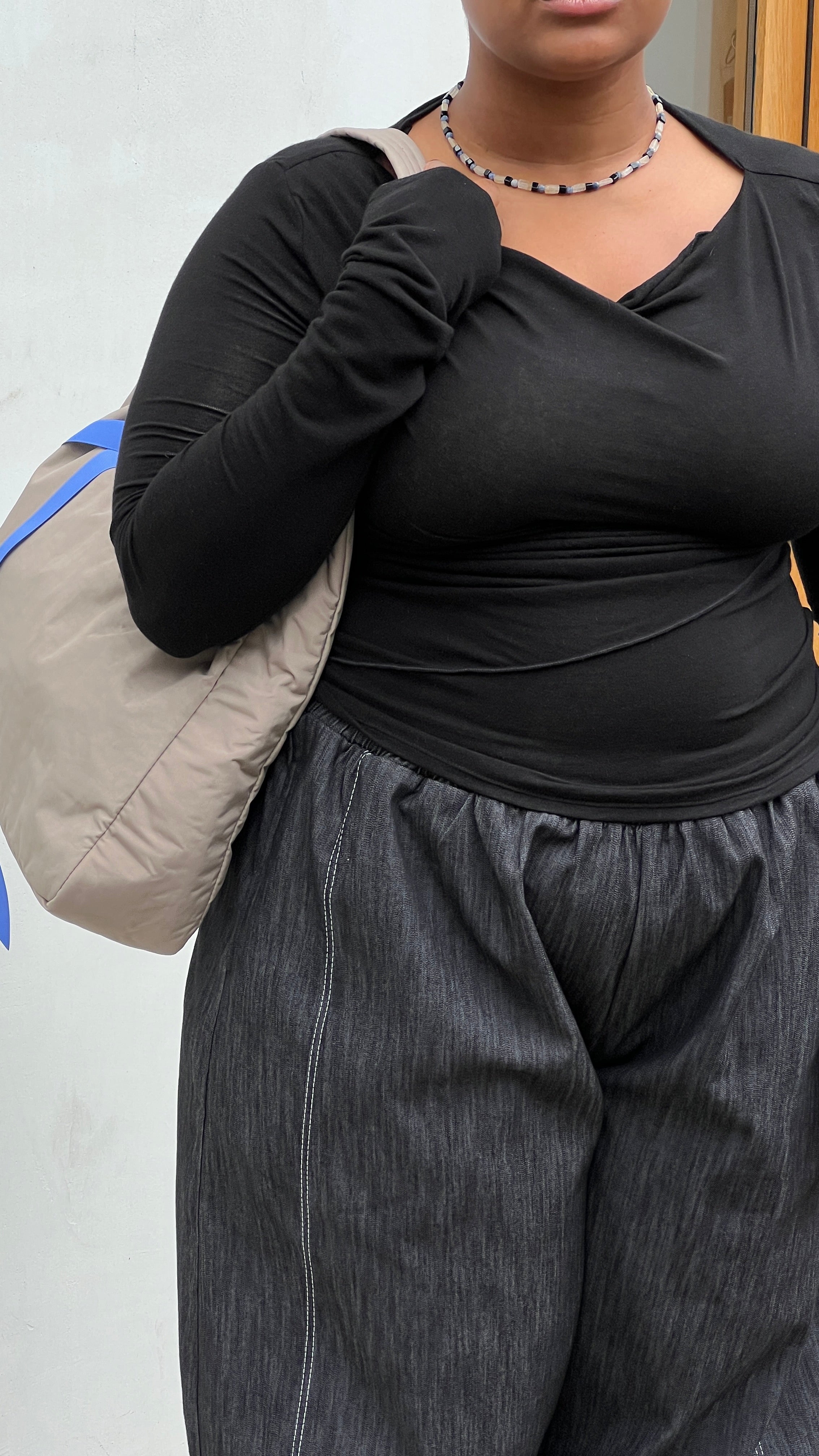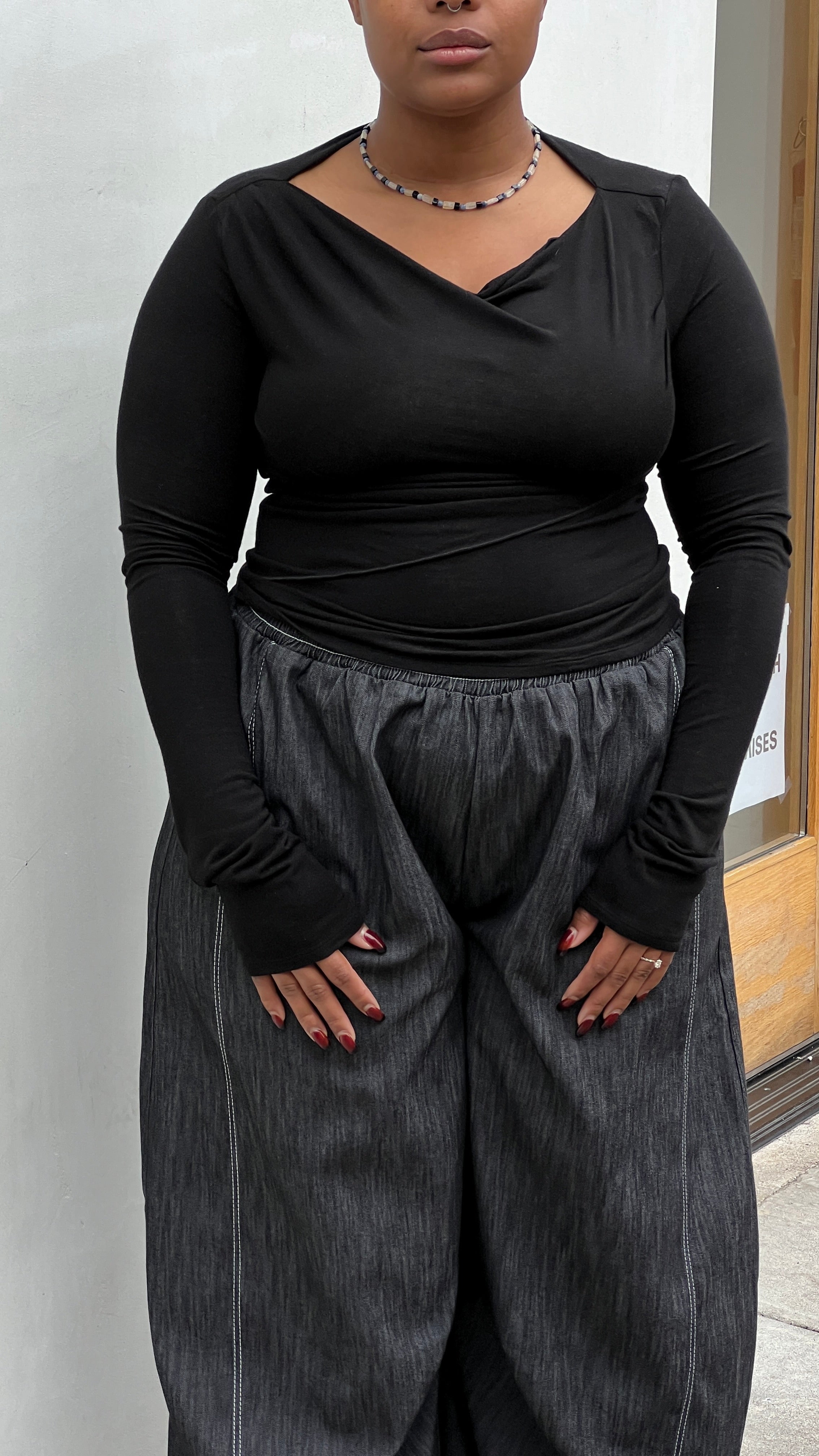 The Drew- A draped neck long sleeve knit top. Made from a super stretchy semi sheer tencel. Features an asymmetric hem.