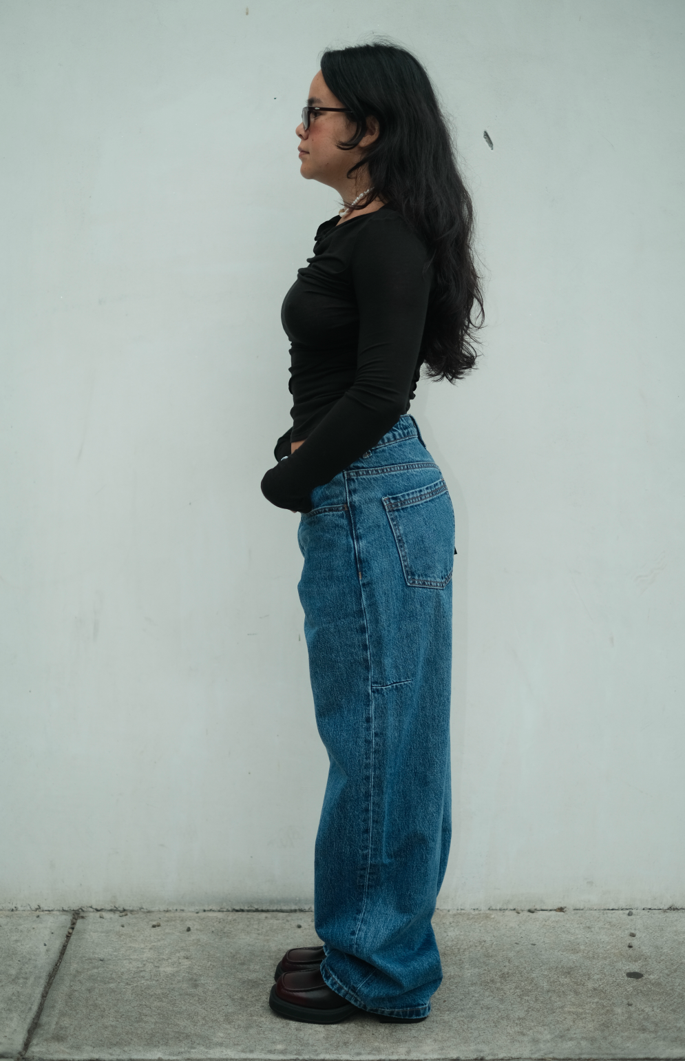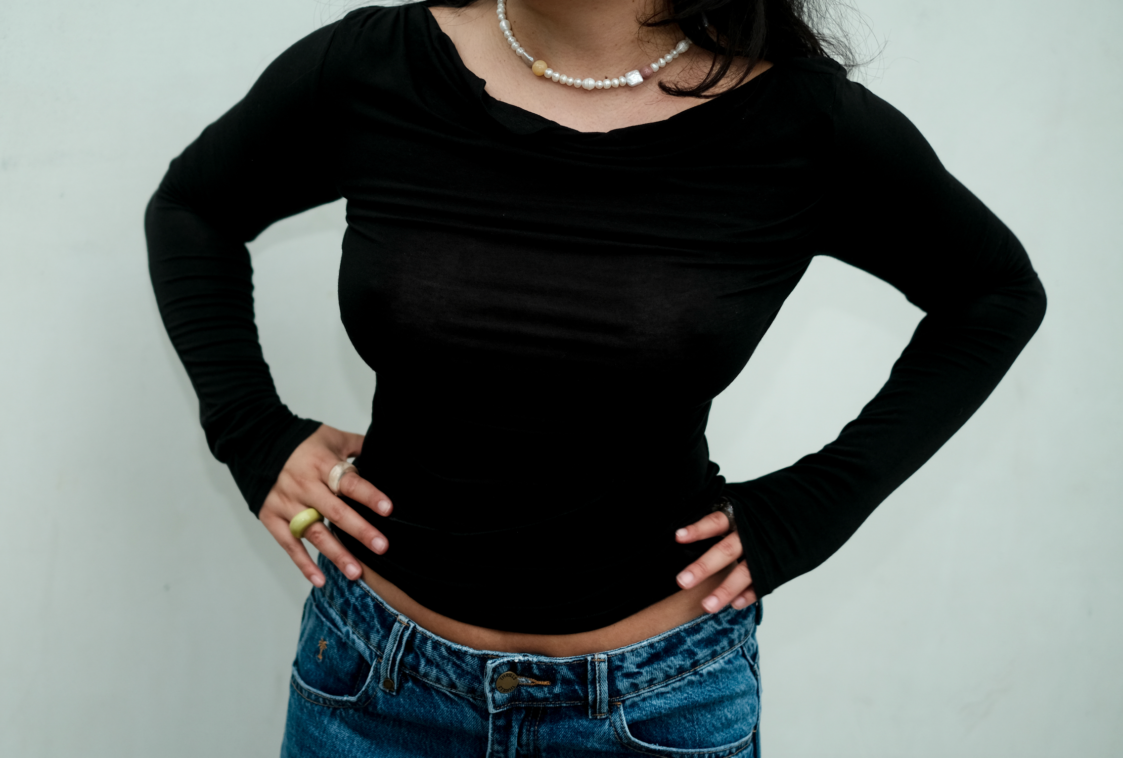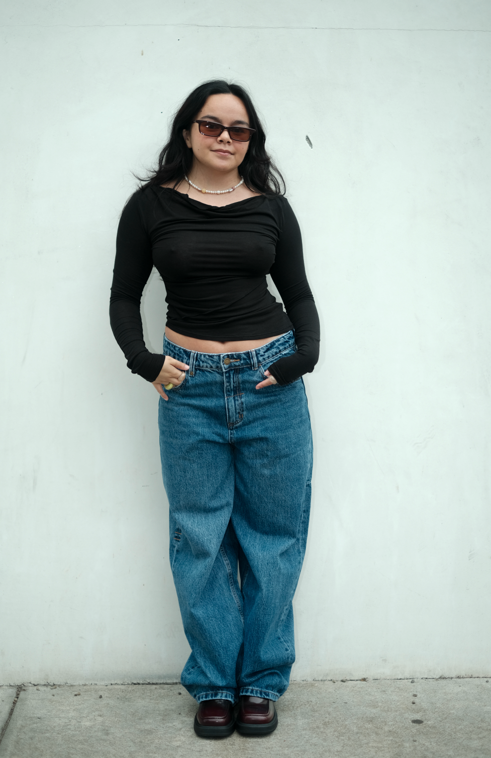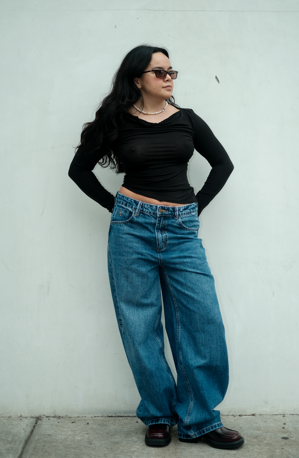 The Drew- A draped neck long sleeve knit top. Made from a super stretchy semi sheer tencel. Features an asymmetric hem.
