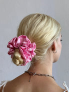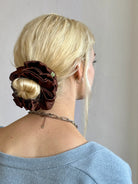 Voluminous satin ruffle scrunchie, wraps multiple times but retains a gorgeous silhouette. midi is a more medium scale, measures 6" Made in Philadelphia, PA.