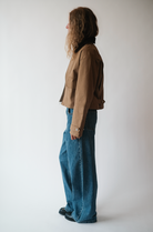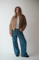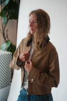 The Wolf Jacket is a work-style zip-up jacket with a contrast corduroy collar, front flap pockets, and an adjustable button-back hem and sleeve cuffs for added utility. Pair it with denim shorts and boots for a refined workwear look.
