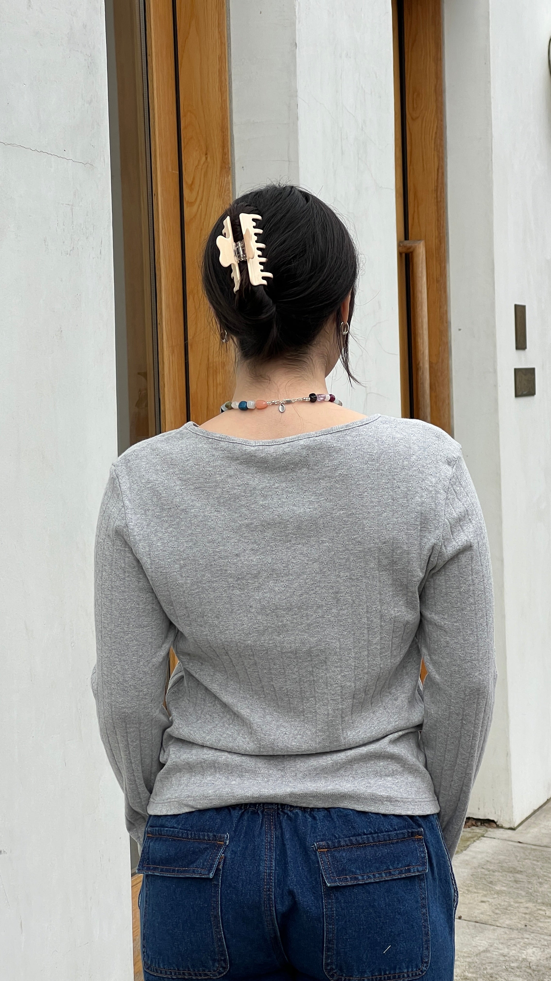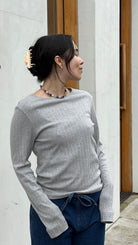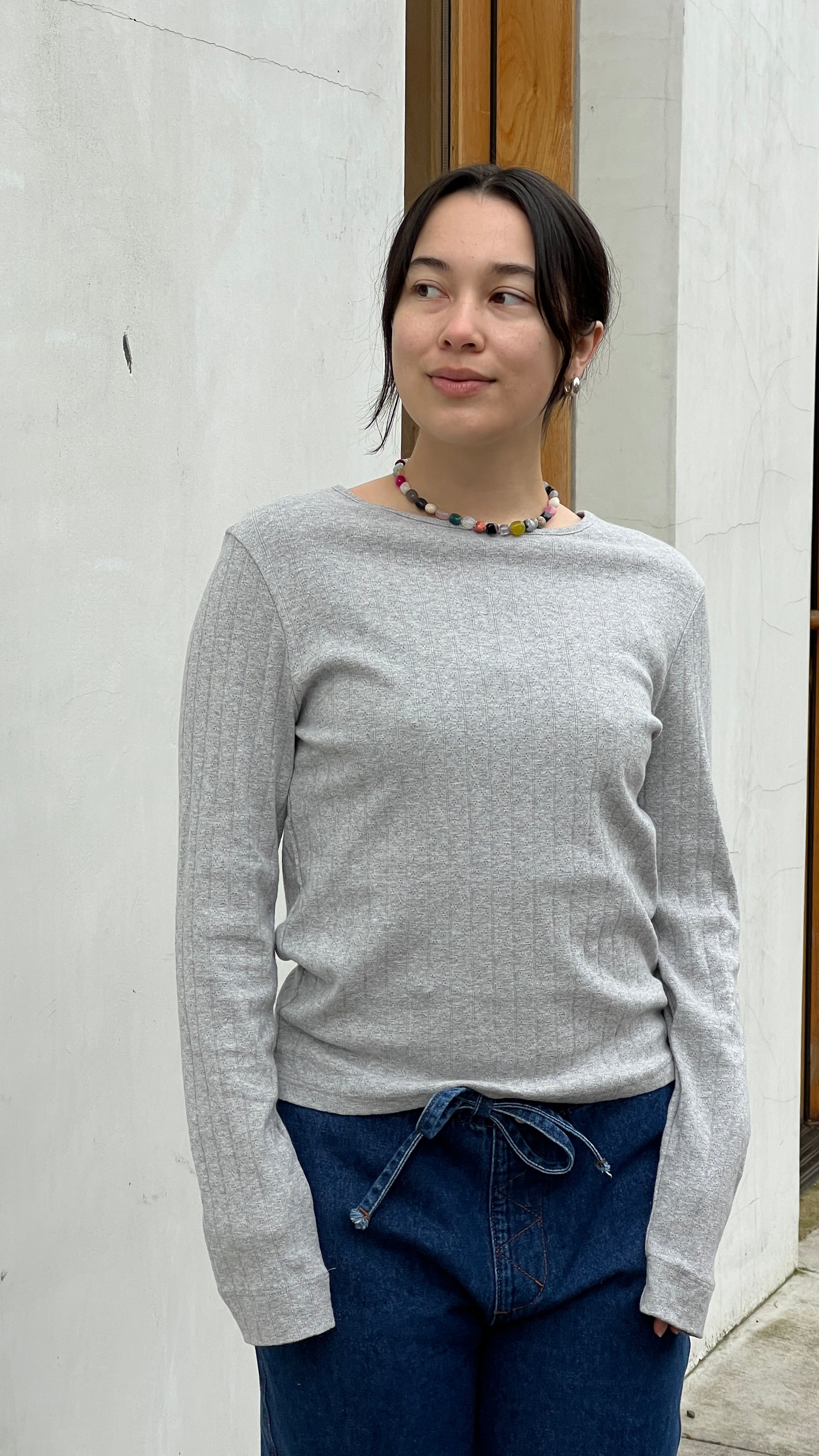 A simply perfect long sleeve crew neck tee with vintage inspired textured jacquard rib fabric. Features neck binding and a relaxed fit. Locally knit from responsibly sourced Organic Cotton yarn and dyed with bluesign™ dyes.