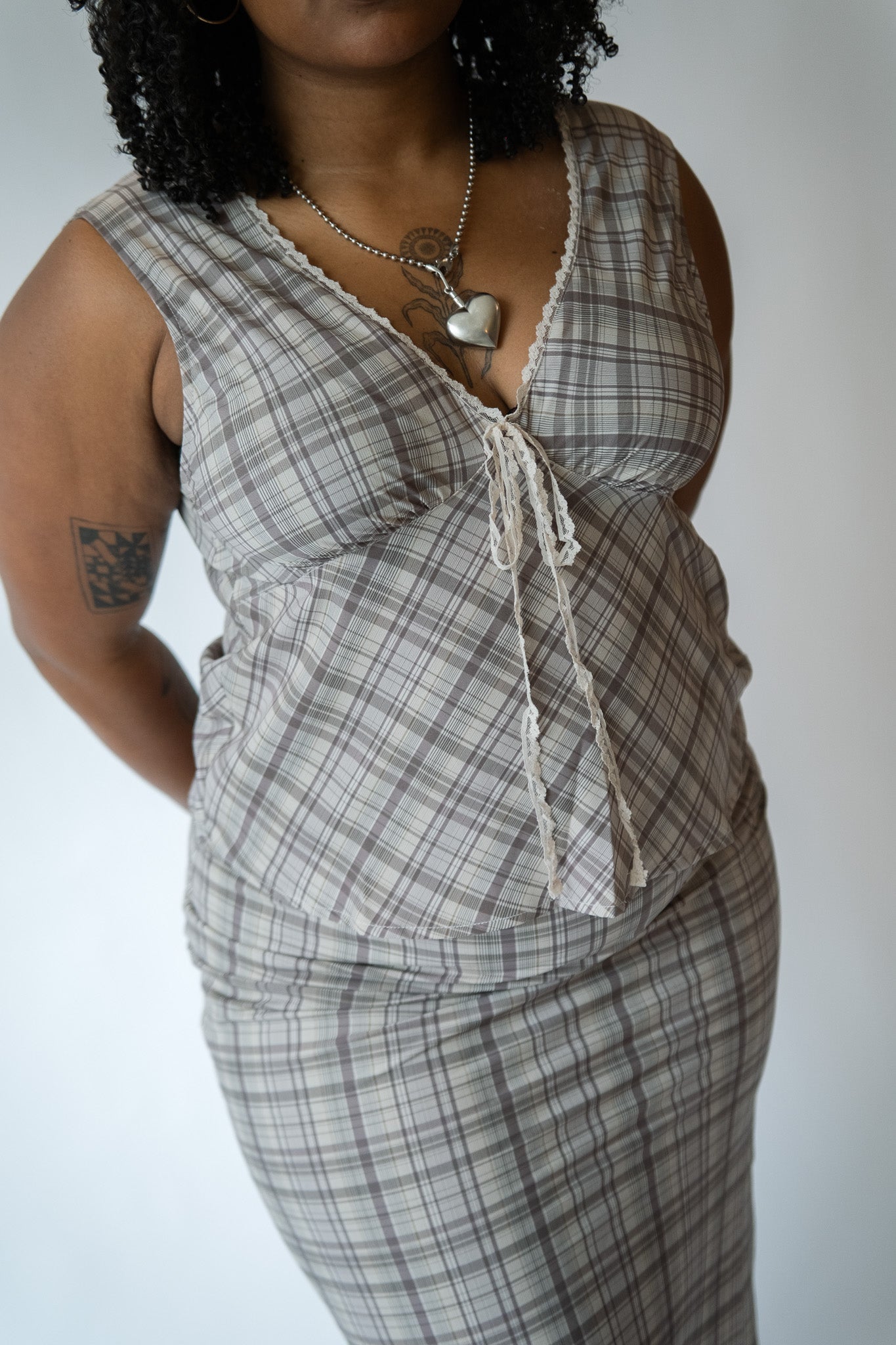 The Paxton Top is a relaxed sleeveless blouse featuring a V-neckline adorned with a delicate lace trim around the neckline and lace front tie. Pair on it's own or with its matching set, The Paxton Skirt.
