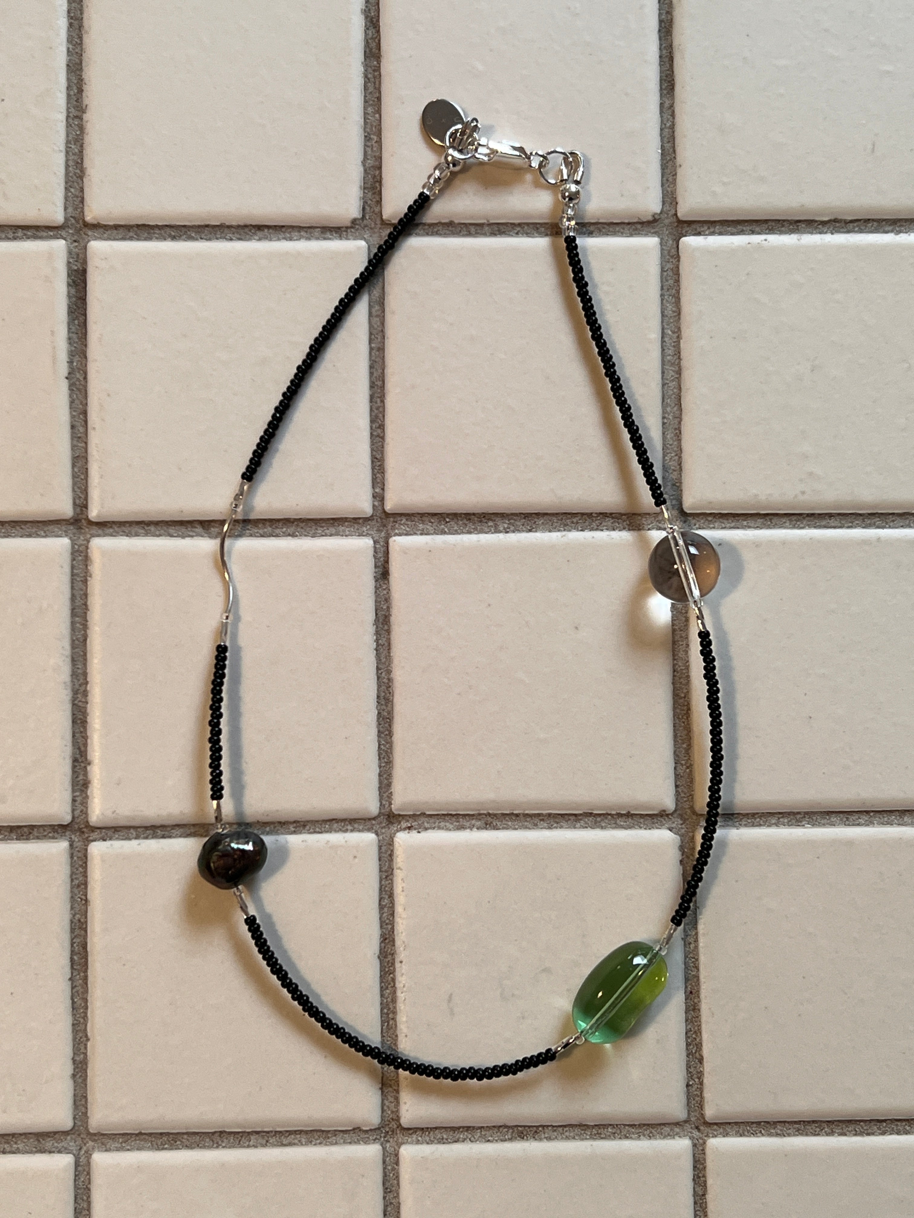 Materials: Necklace made of black japanese seed beads, sterling silver tubes, single clear quartz, tahitian pearl, and glass bead. Style comes in 4 color ways. Wire cord with sterling silver hardware.