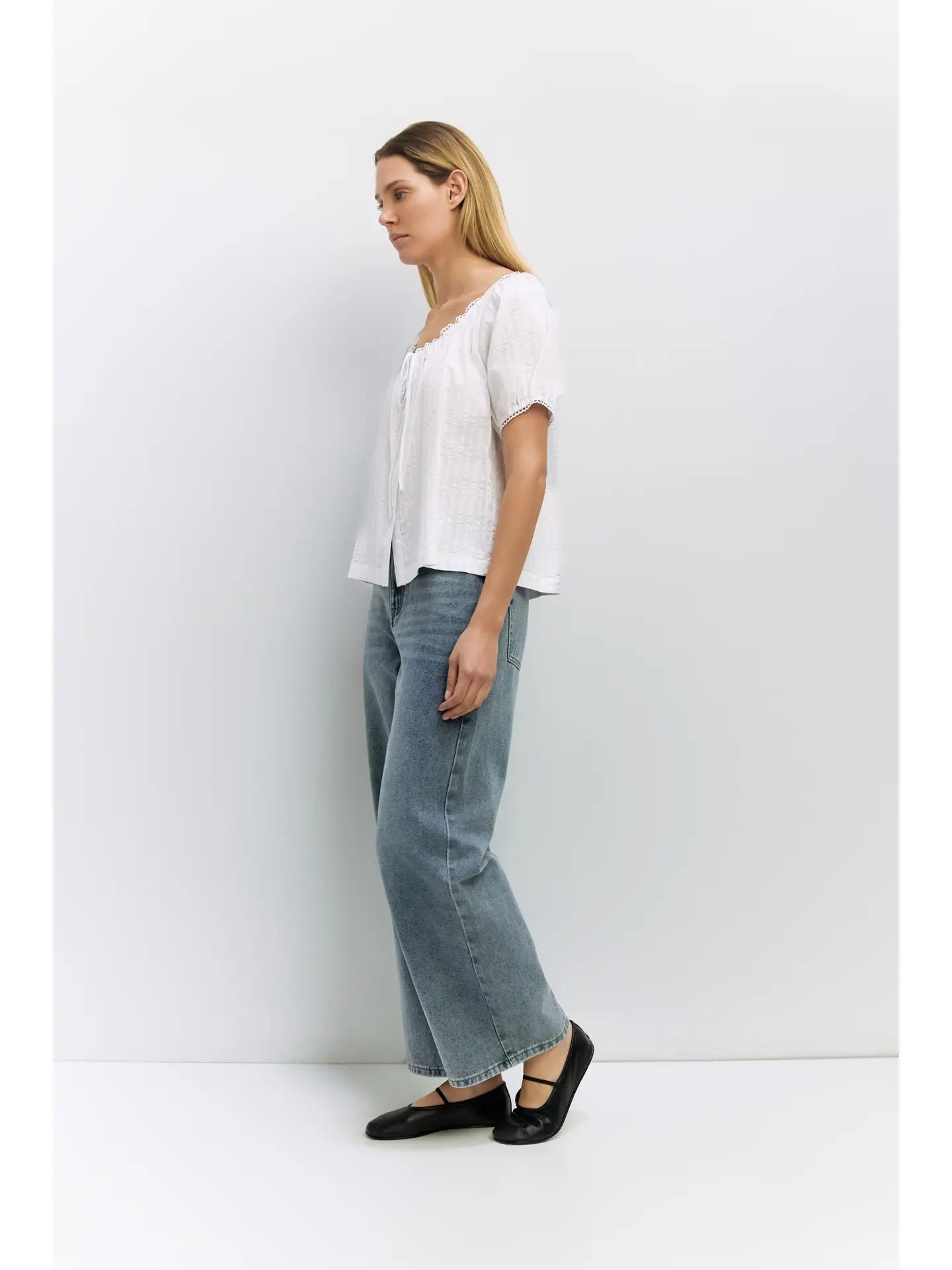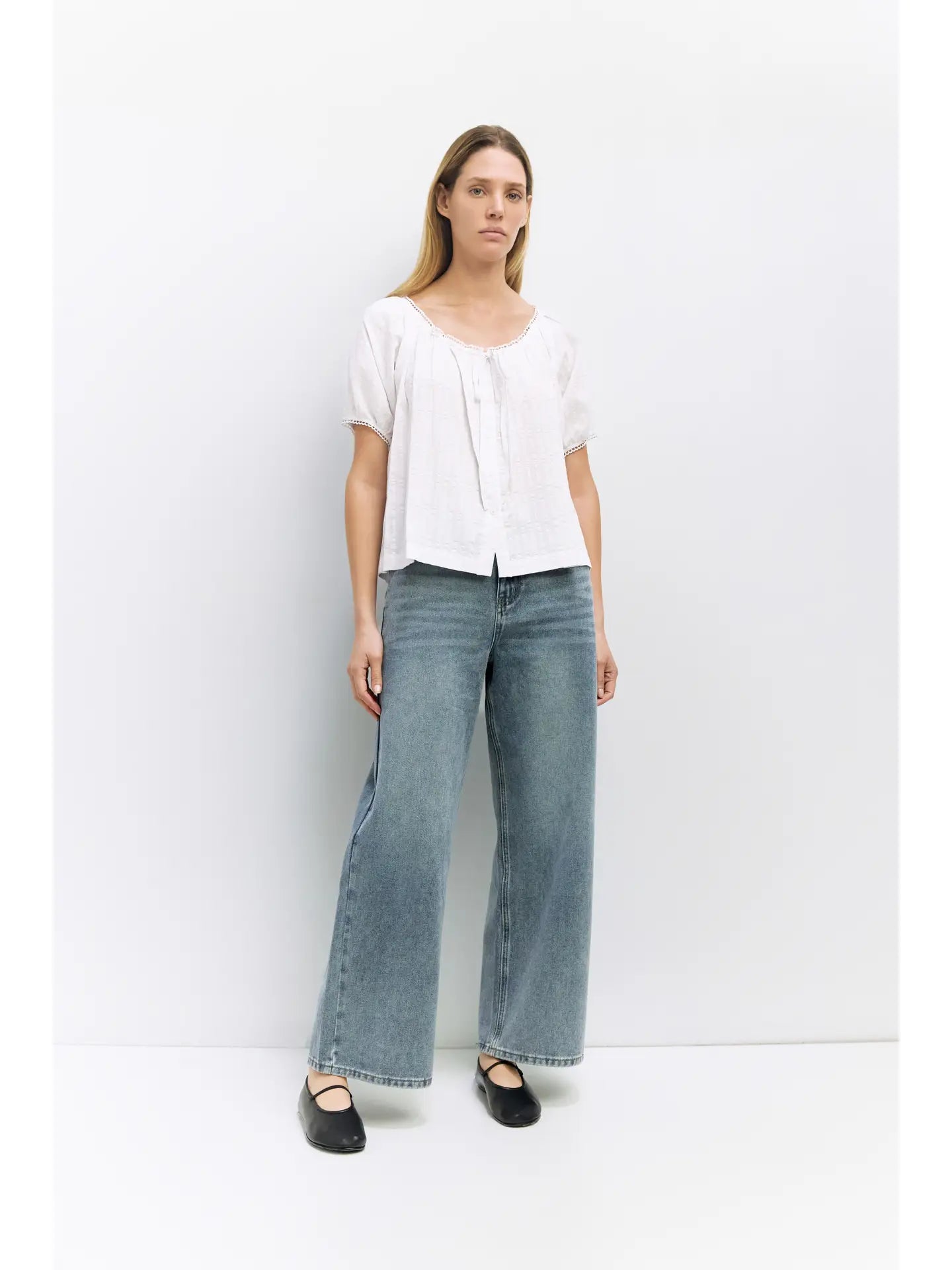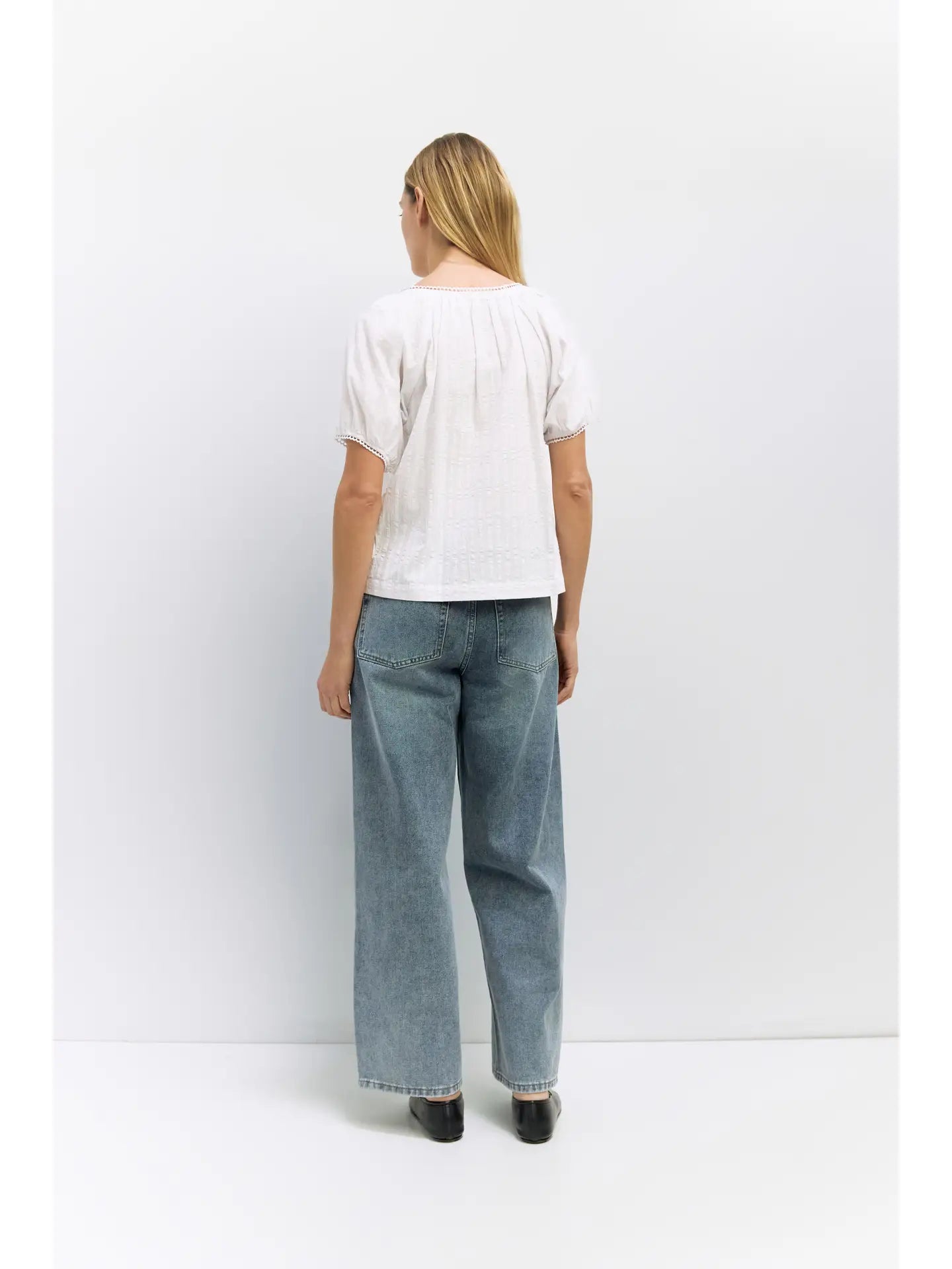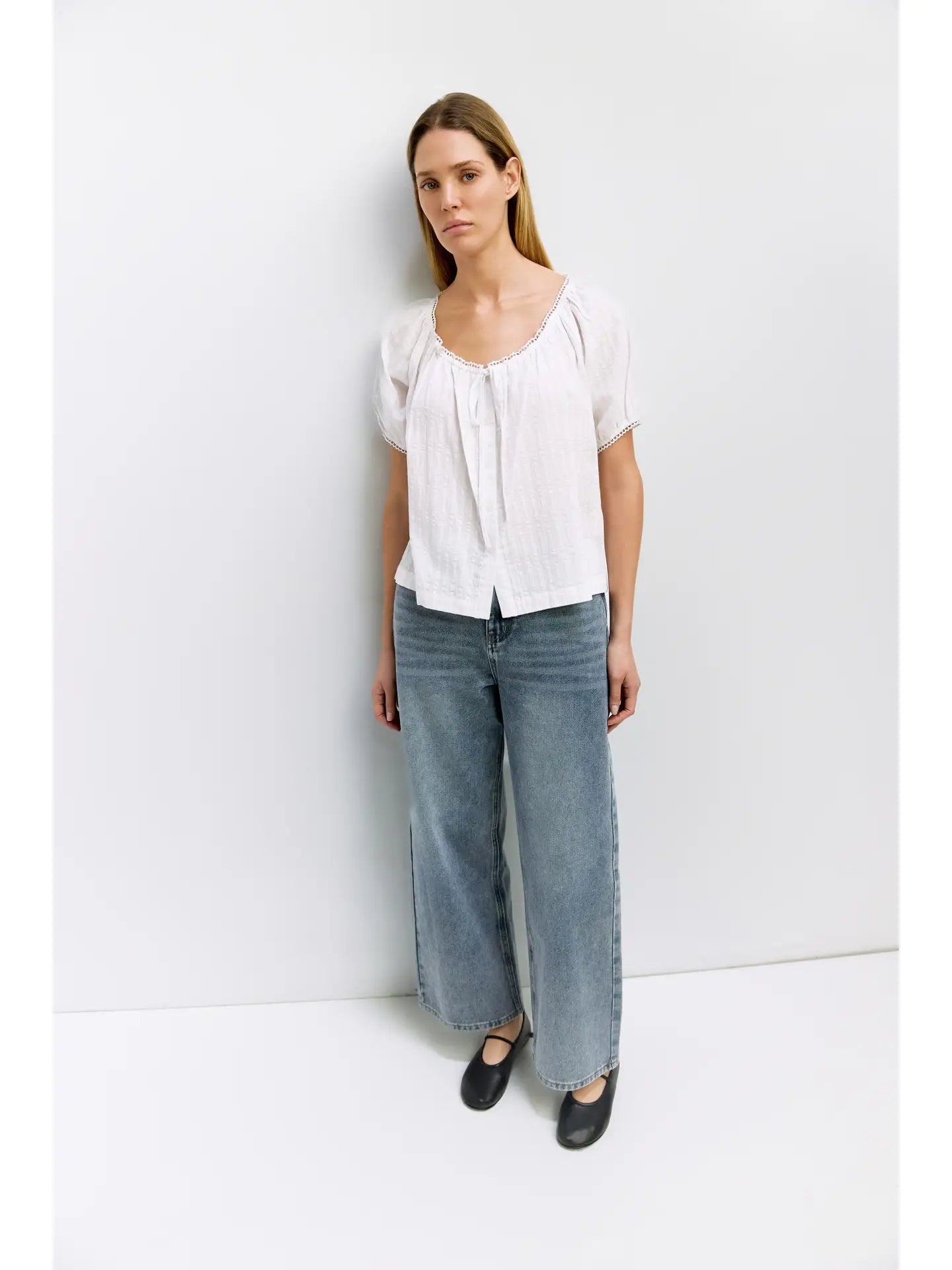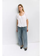 The Amaya Top is designed from embossed stripe cotton with a loose, relaxed fit. It has a wide scoop neckline with a tie and scallop trim, short raglan puff sleeves with elasticized cuffs and scallop detailing, and a full front button closure.