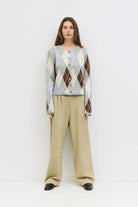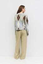 The Gayle Cardigan is a relaxed-fit knit featuring a classic argyle design. It has a crewneck, long sleeves, and a front button closure. Made from midweight knit, it’s a timeless layering piece.