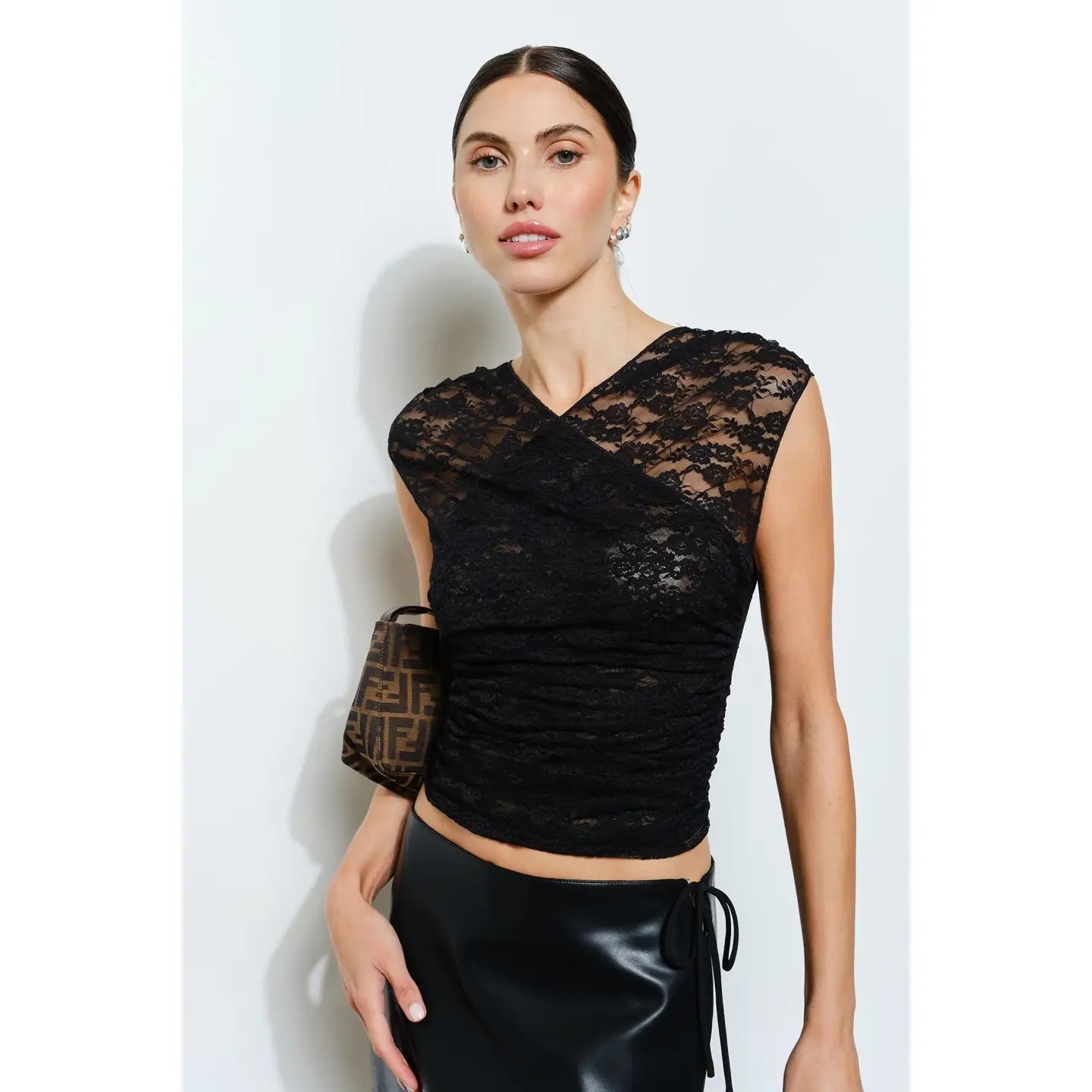 The Nola top is crafted from delicate floral stretch lace for a romantic feel. It features a flattering surplice neckline and a ruched body that contours the figure. This sheer piece is perfect for layering or wearing as a stand alone top.