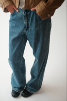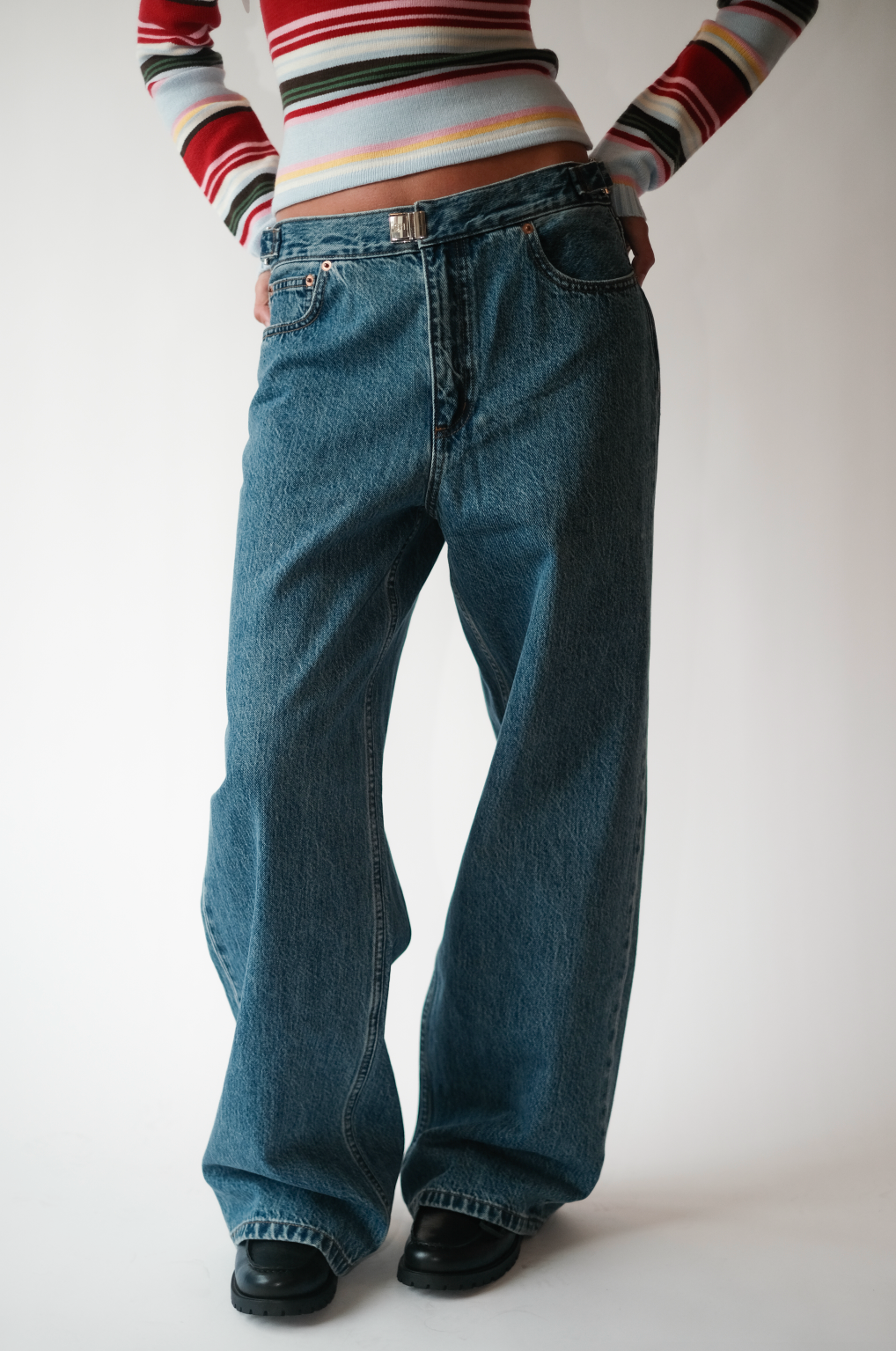 The Buckle jean is a relaxed leg, subtle drop-crotch with a 31" inseam. It features Still Here custom chrome buckle hardware and adjustable waistband side fasteners, allowing it to be worn as both a mid or low-rise jean.