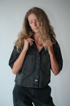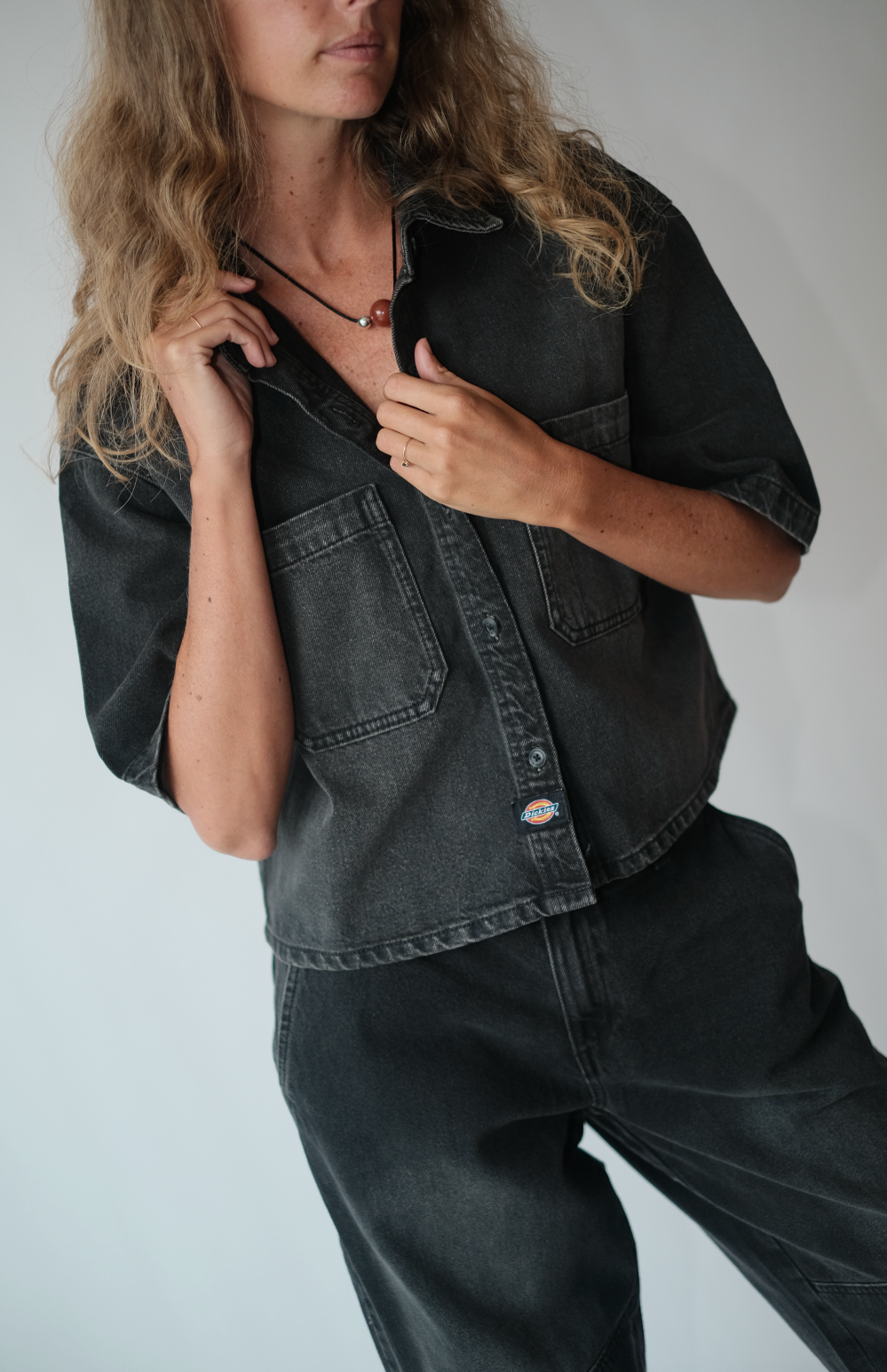 Built for functionality with a modern edge, this Women's Cropped Denim Work Shirt delivers durability without compromising on fit. The shirt is crafted from 100% cotton denim and finished with a sanded wash. It features a boxy fit, cropped length, and roomy half sleeves for easy movement.