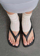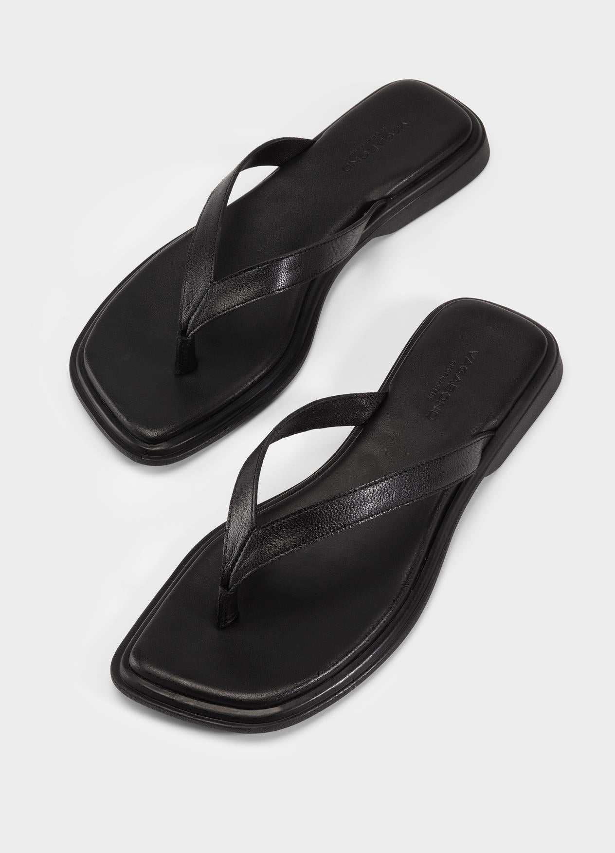 Sleek flip-flops with a streamlined design. Izzy has a square toe shape and is crafted from black leather.