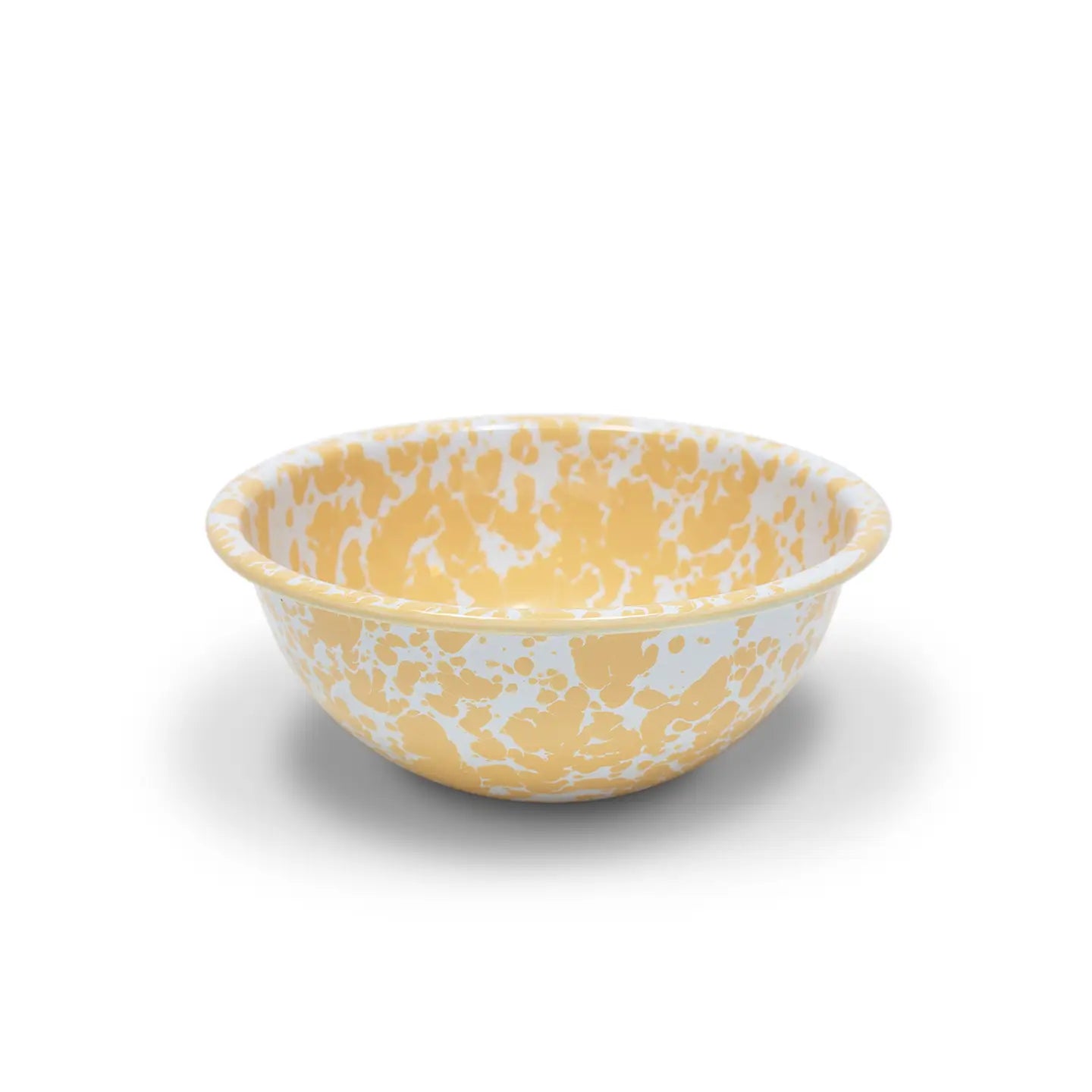 Colorful 20 oz splatter enamel cereal bowl on steel