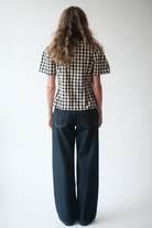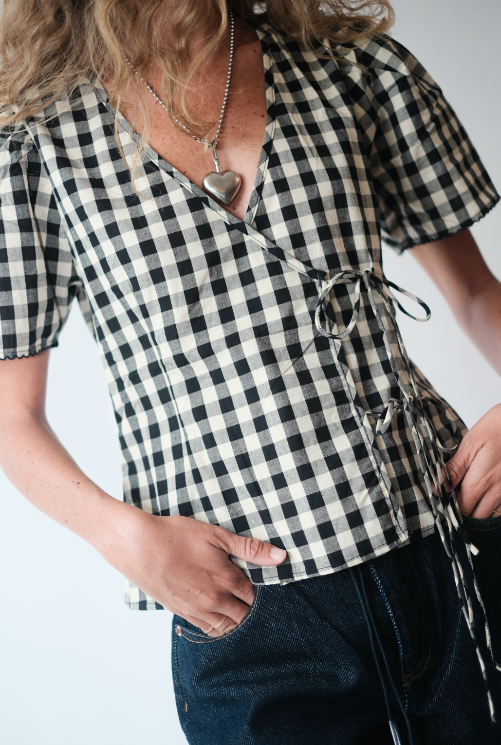 The Bridget Top is a gingham blouse featuring a flattering V-neck and short puff sleeves with scalloped embroidered hems. The wrap tie front adds a customizable fit with a touch of feminine charm.