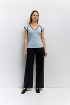 The Patricia Top is crafted from a midweight cotton-blend knit with a form-fitting silhouette. Its V-neckline and raglan cap sleeves are accented with contrast stripes at the neckline, cuffs, and armhole seams for a retro-inspired look.