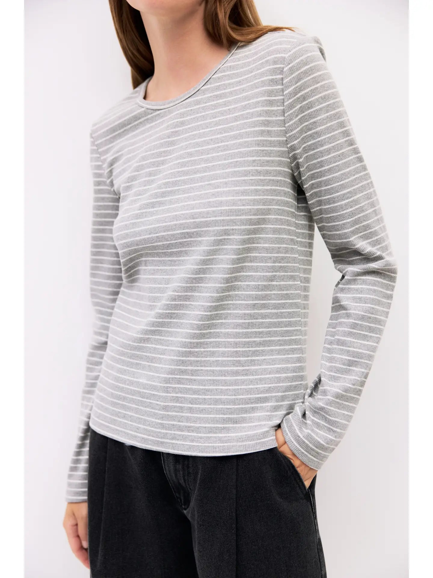 The Sora Top is a form-fitting, long-sleeve crewneck crafted from midweight ribbed striped knit. Its streamlined silhouette and classic stripes make it a sleek layering essential.