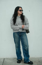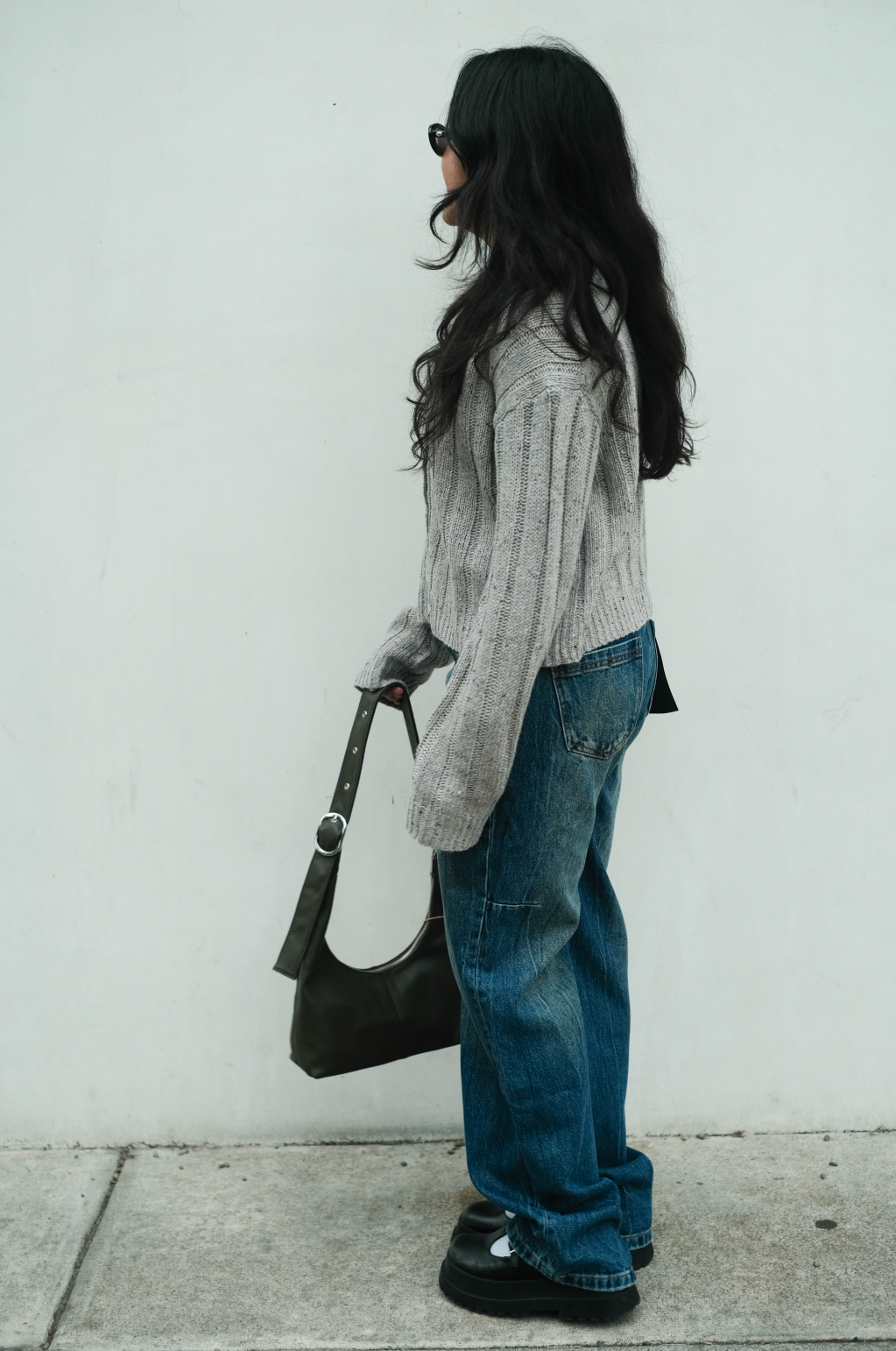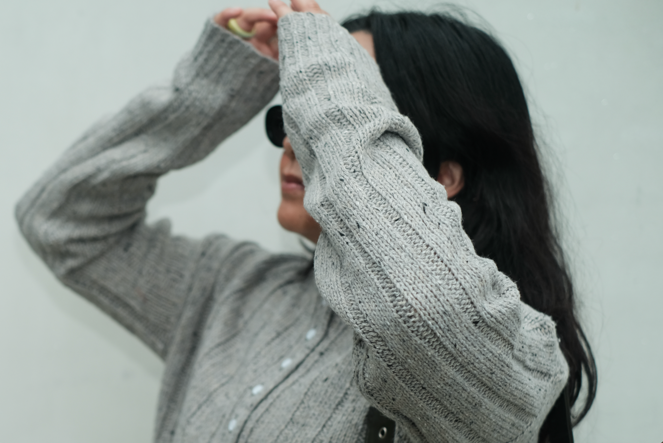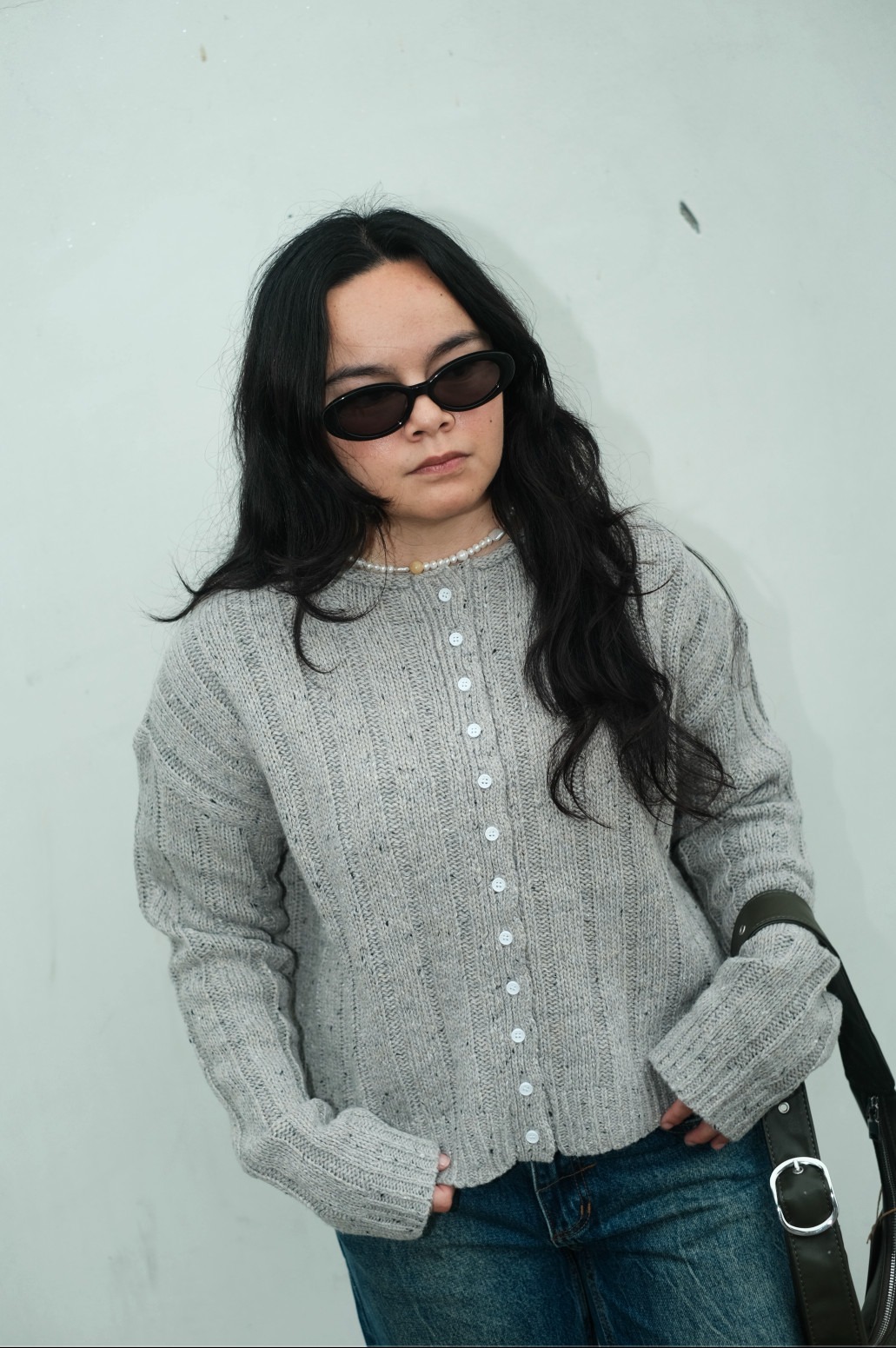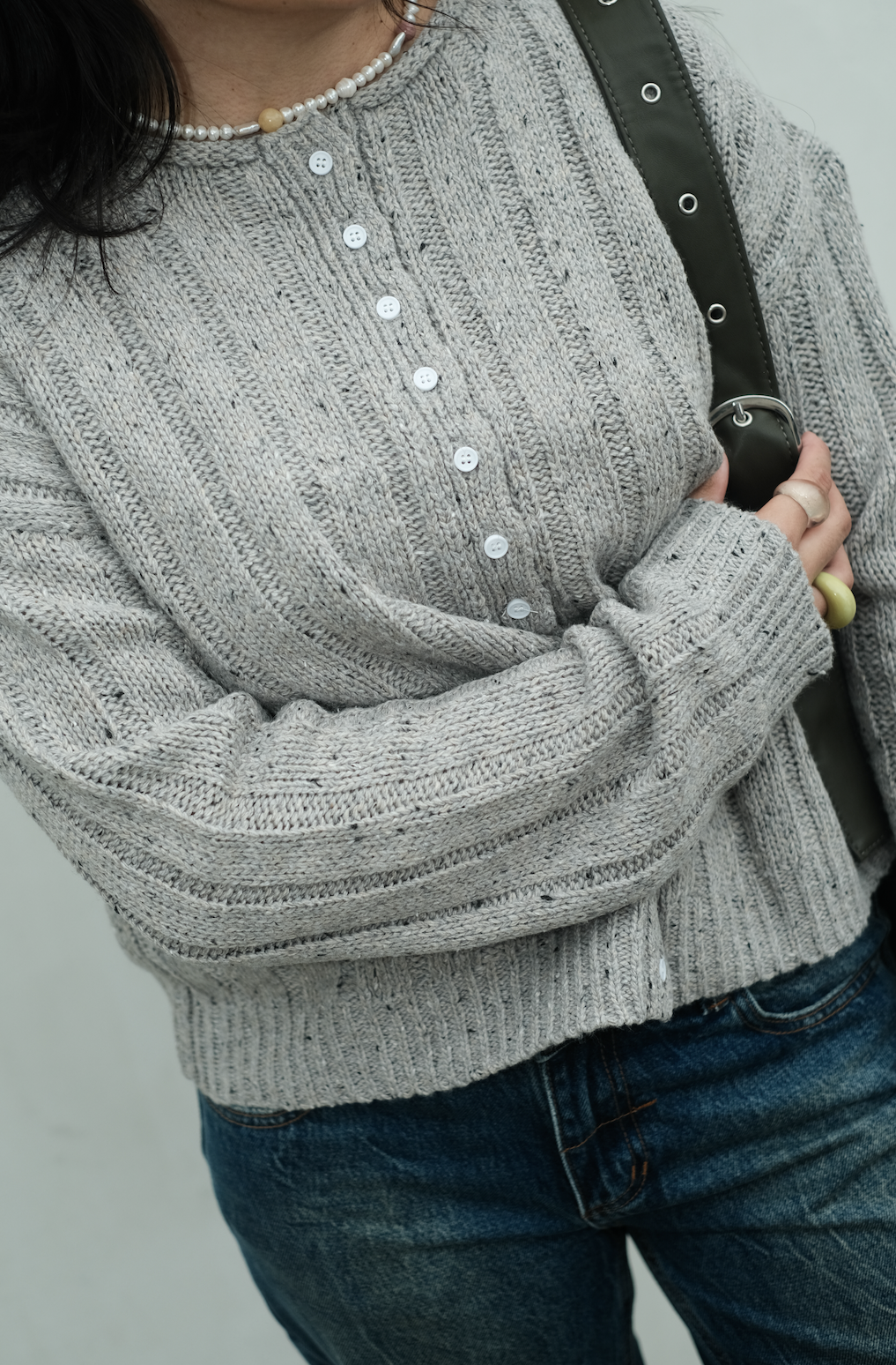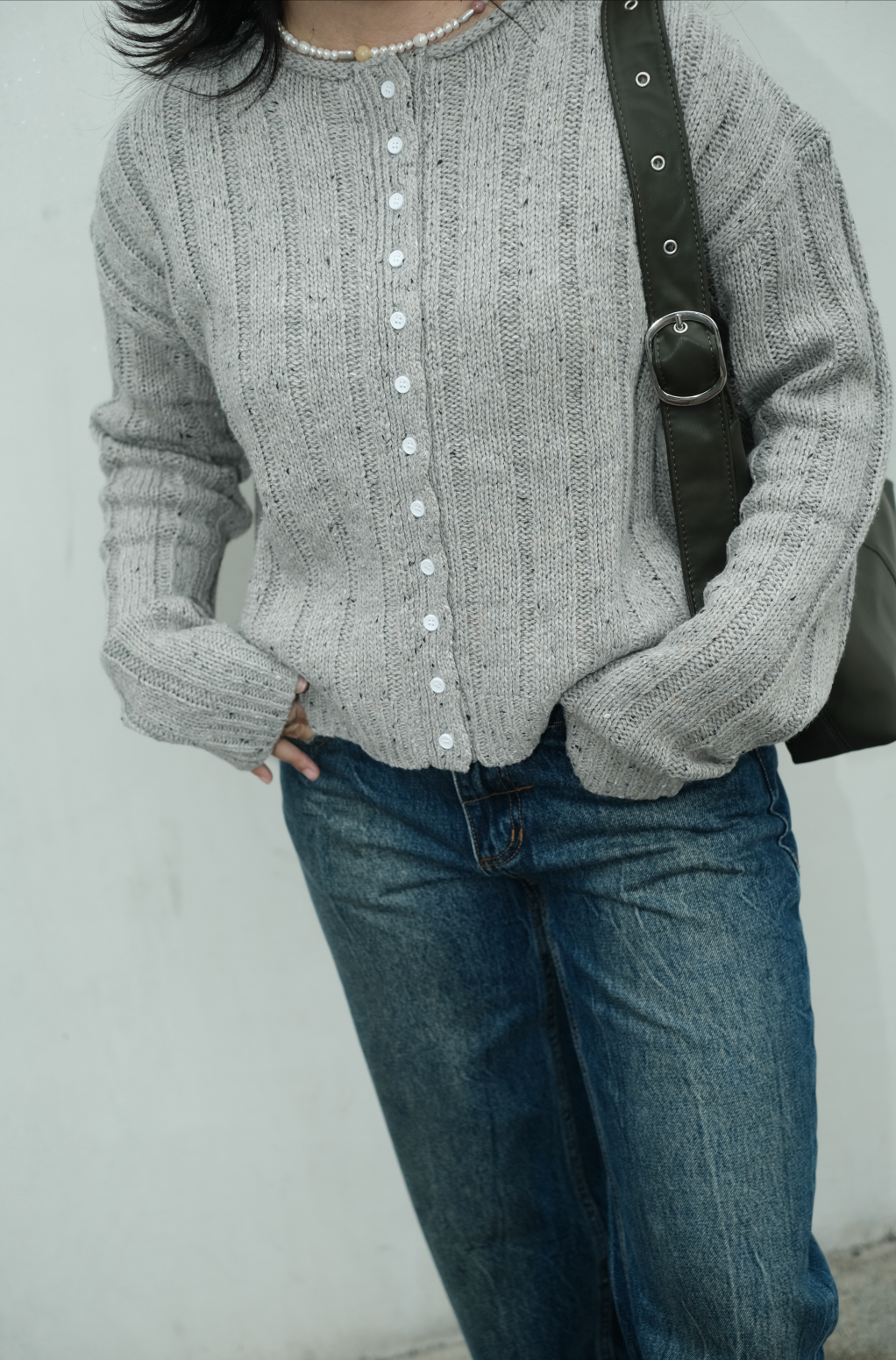 The Theodora Cardigan is a chunky ribbed knit cardigan designed with a speckled finish for added texture and depth. Featuring a rolled crewneck, dropped shoulders, and a relaxed fit, it layers comfortably over any look.