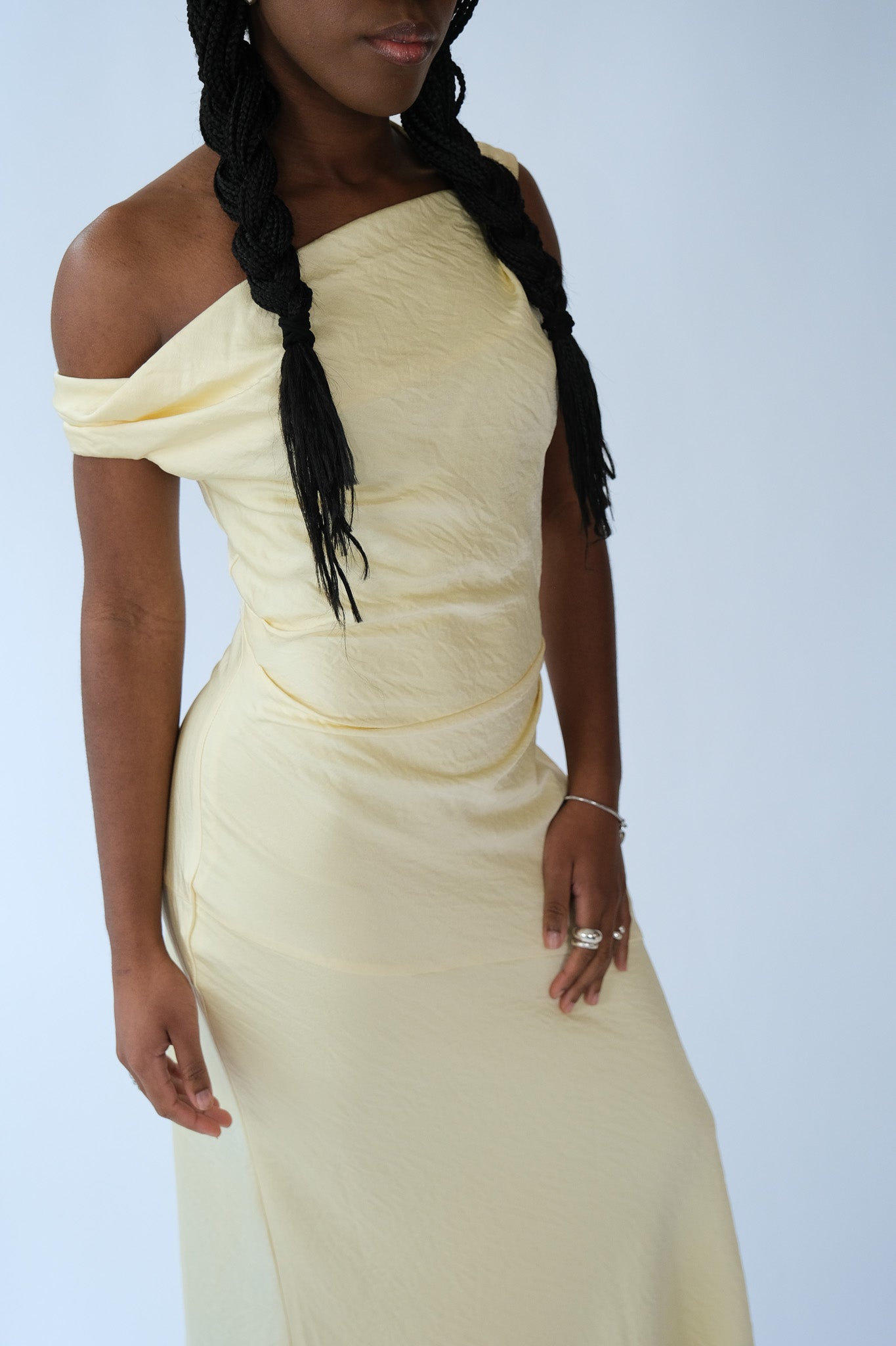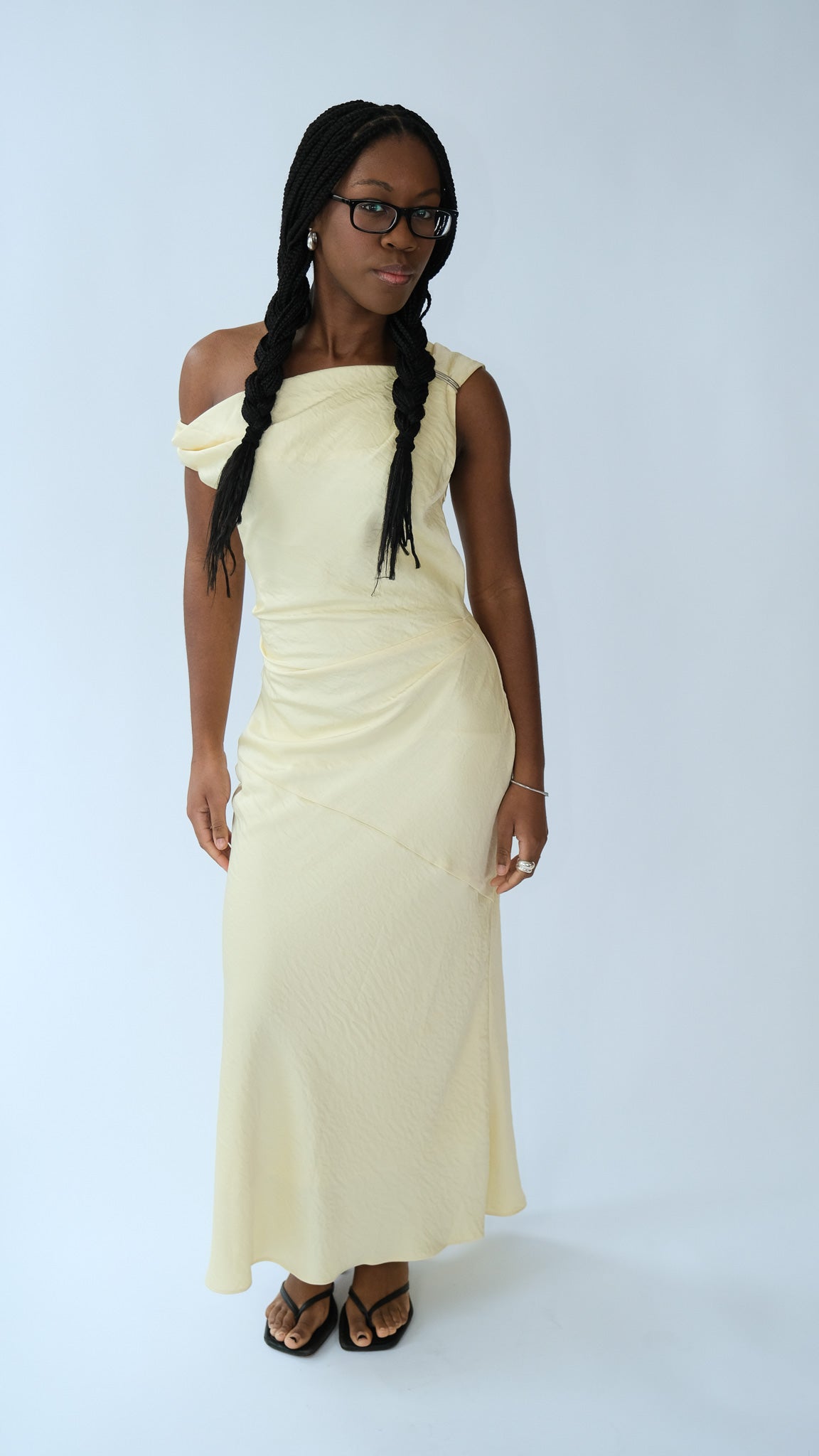 Sculptural and sleek, designed to command attention. The Heidra Dress features an asymmetrical one-shoulder neckline secured with a metal ring detail, bringing a directional edge to a refined silhouette. A lightly structured bodice and diagonally seamed waist create definition before falling into a fluid midi-to-ankle-length skirt. Fully lined and finished with a side zipper, it’s a statement piece grounded in clean lines and considered design.