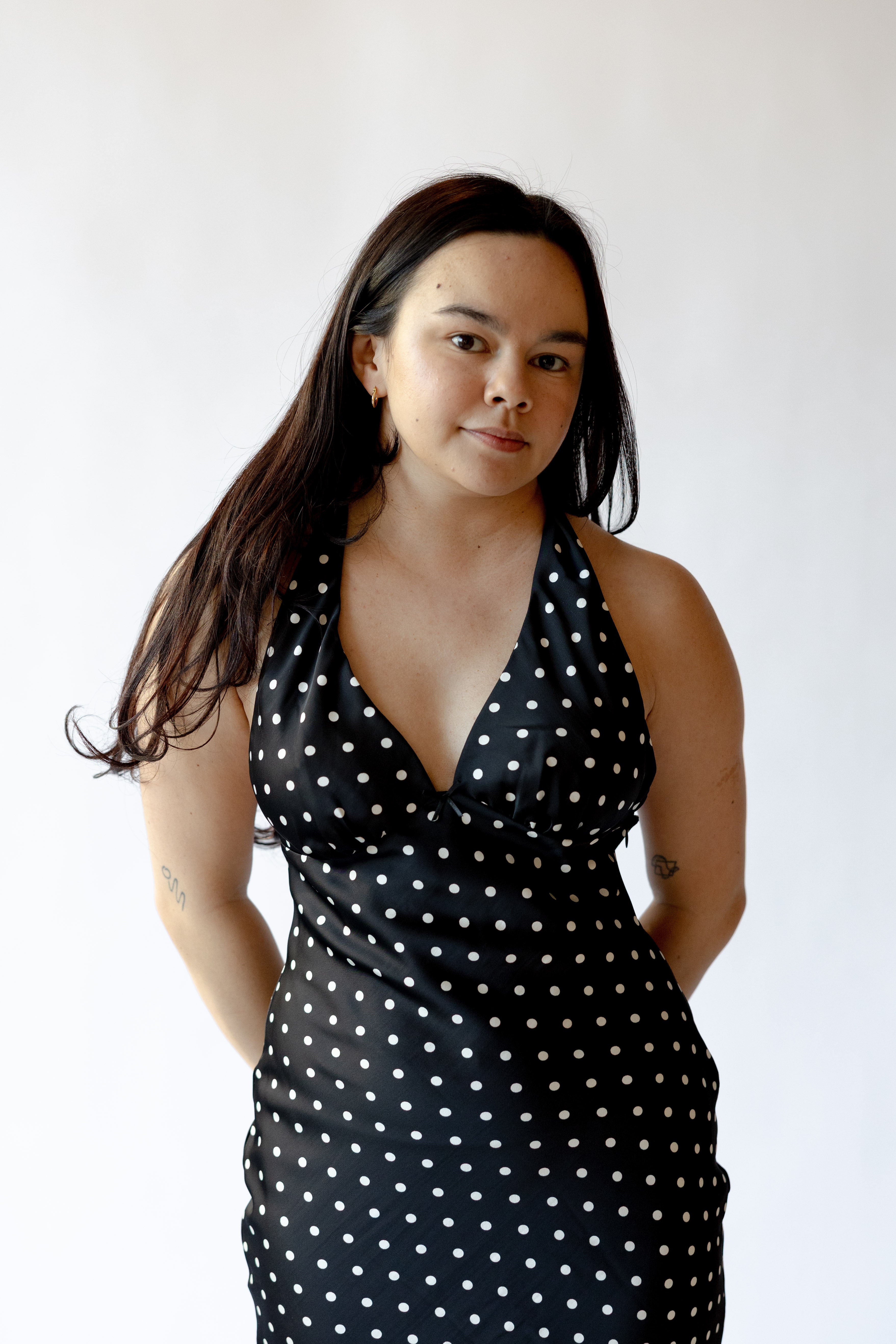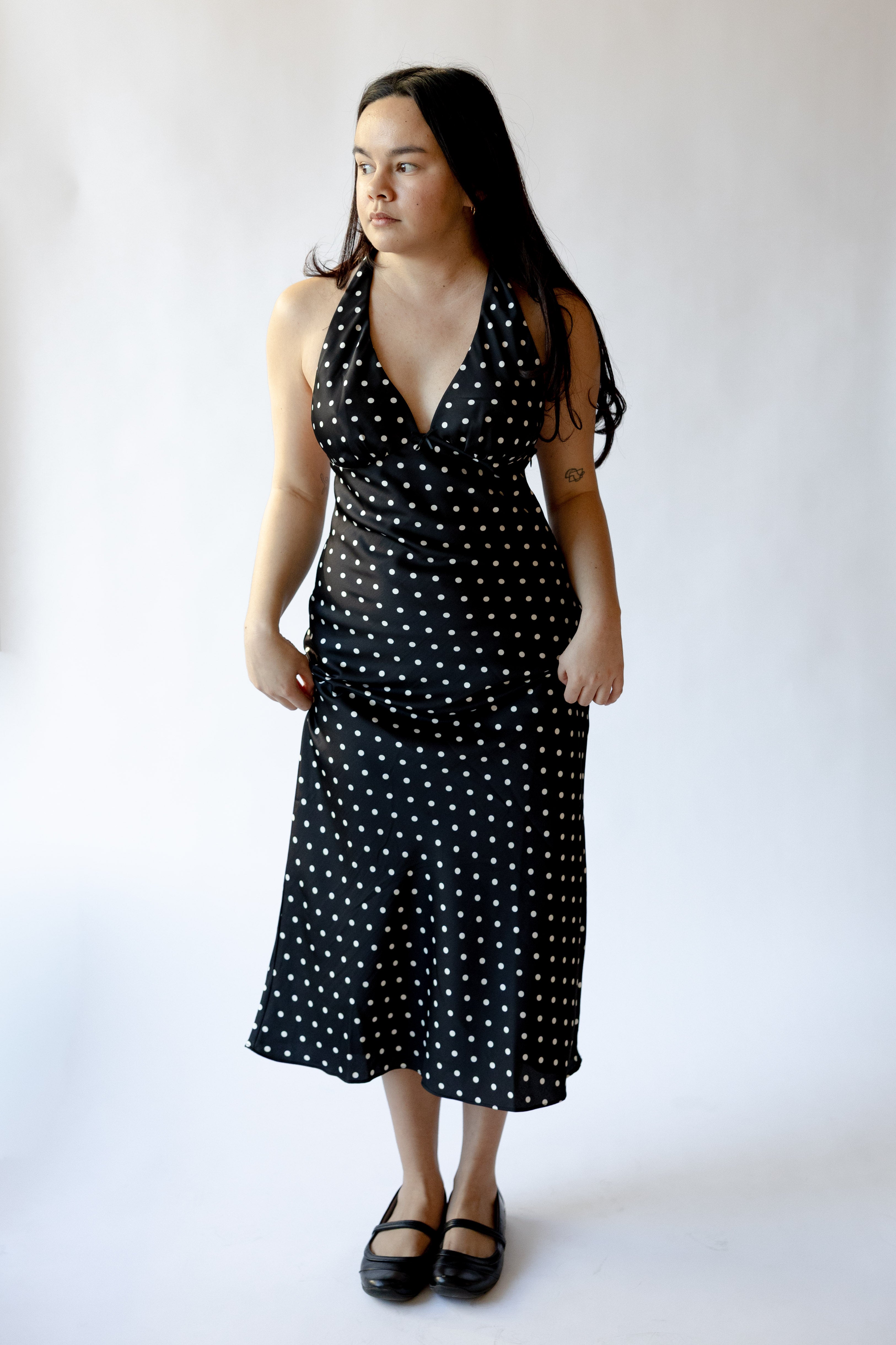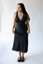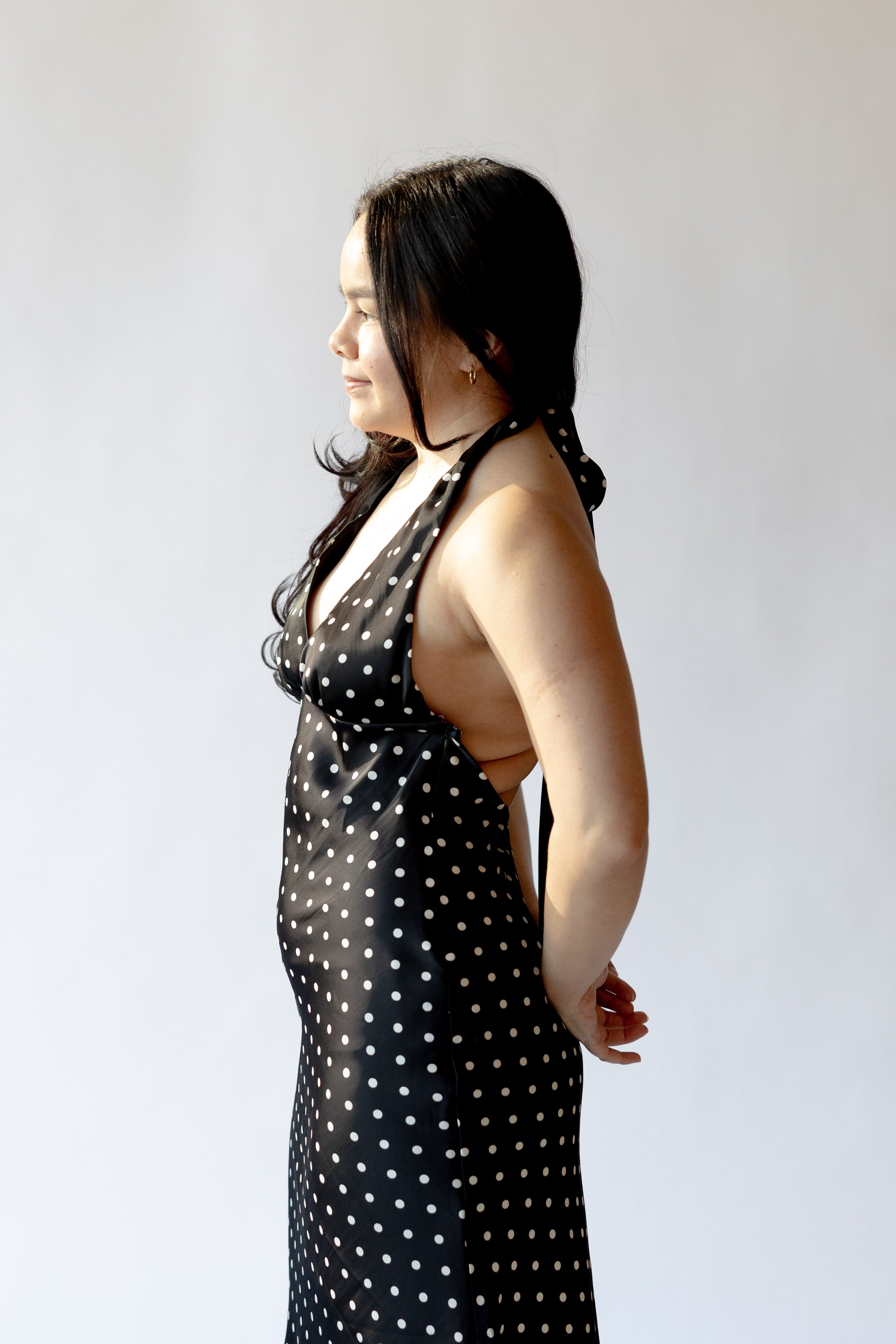 The La Brea Dress blends sleek lines with graceful tailoring for a look that’s equal parts timeless and striking. Cut in a slim, body-skimming silhouette, it features a deep V halter neckline and subtle shaping through the bust and waist to flatter the form. The midi-length skirt finishes with a soft A-line sweep, creating natural movement with every step. An open back with halter ties adds an element of allure, while a discreet side zipper ensures a seamless fit. Fully lined for smooth wear.