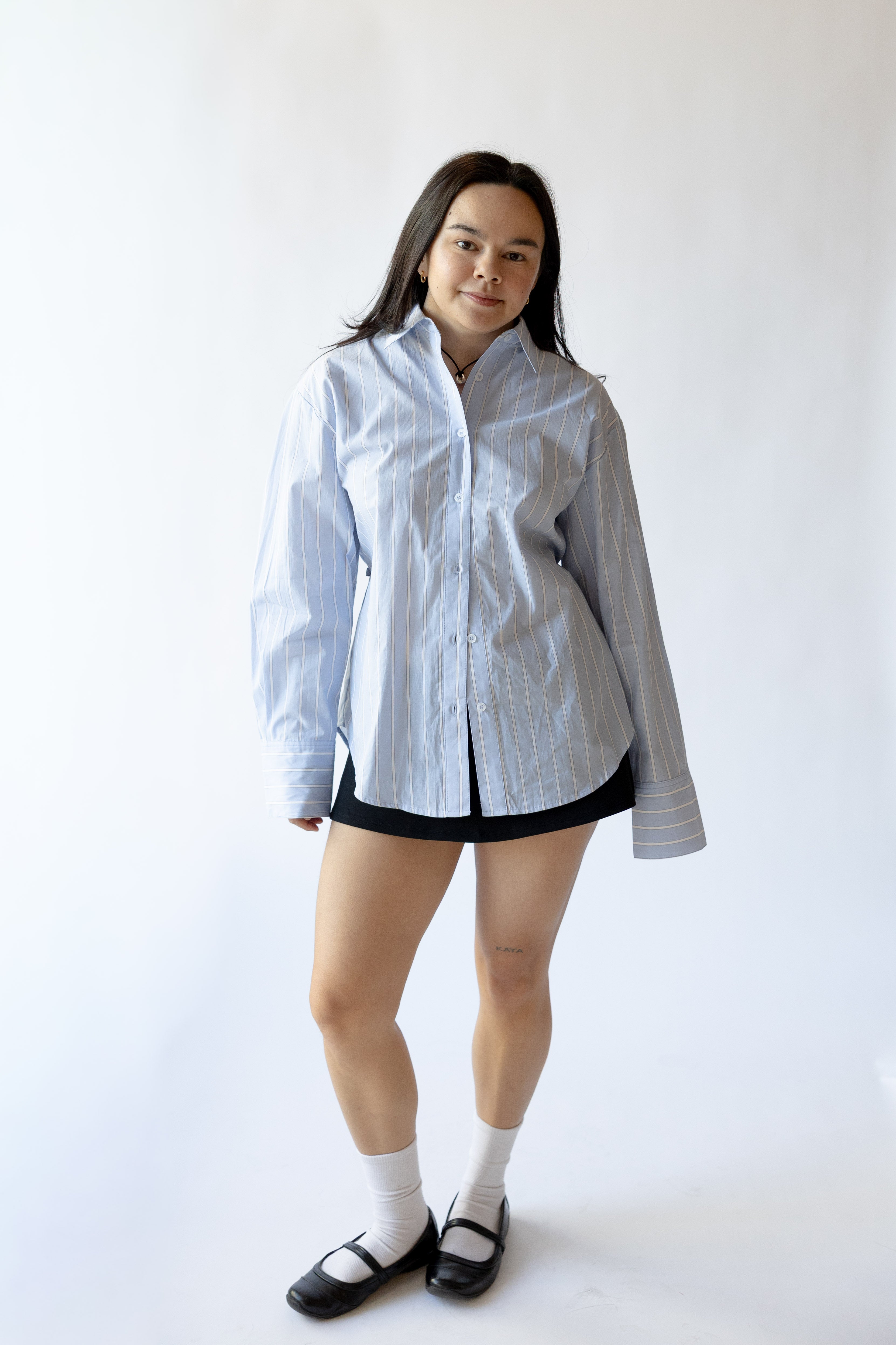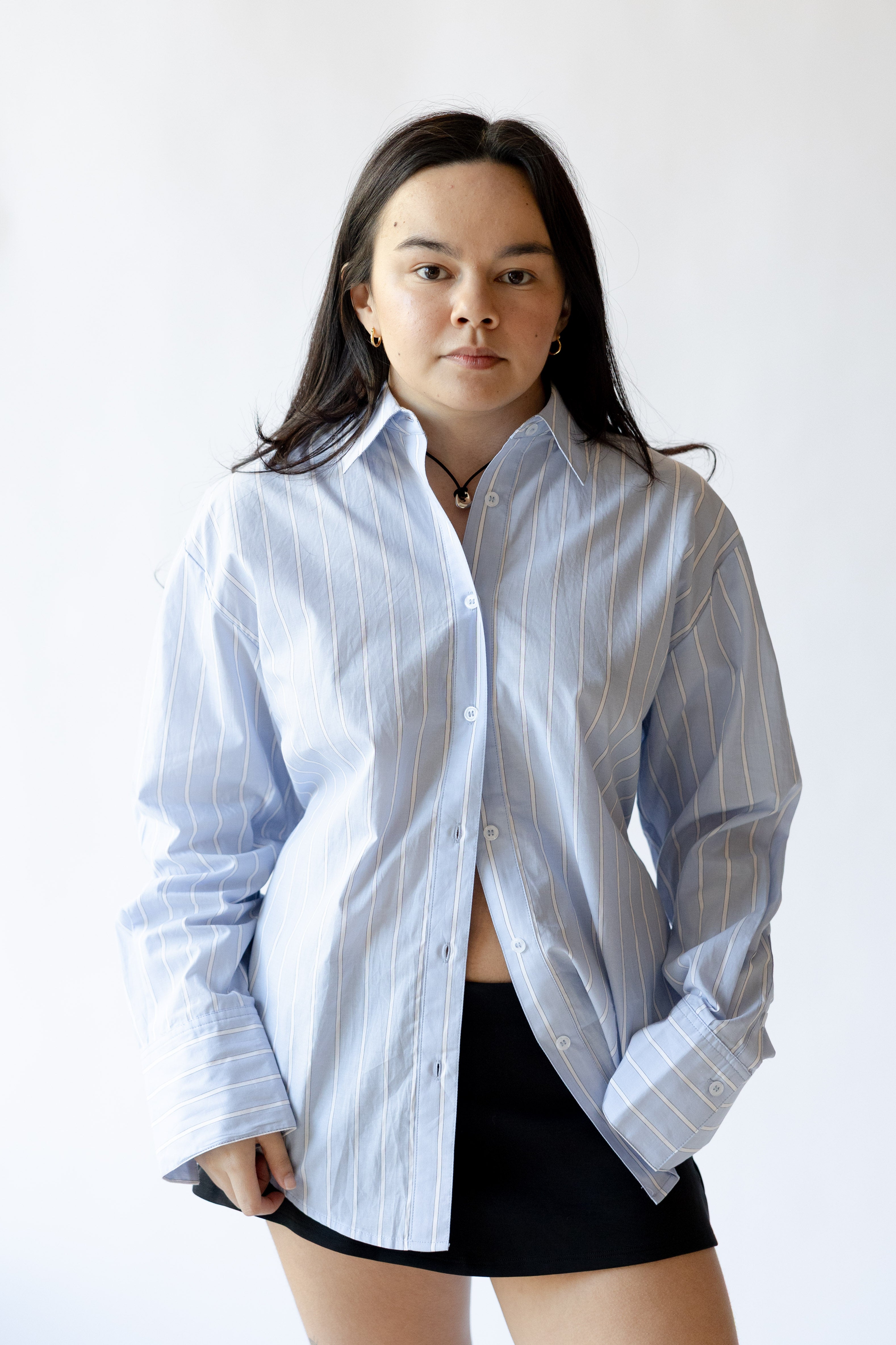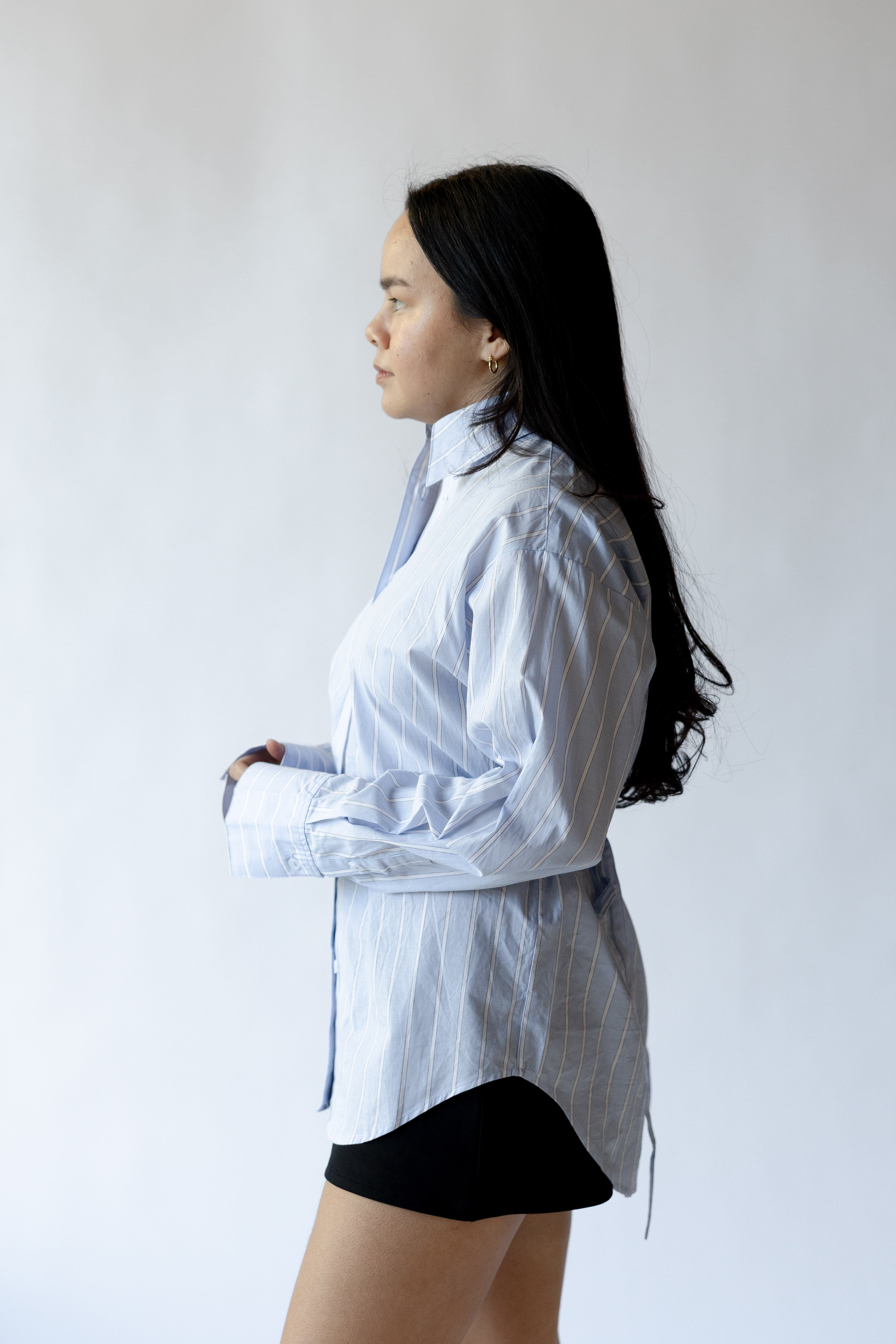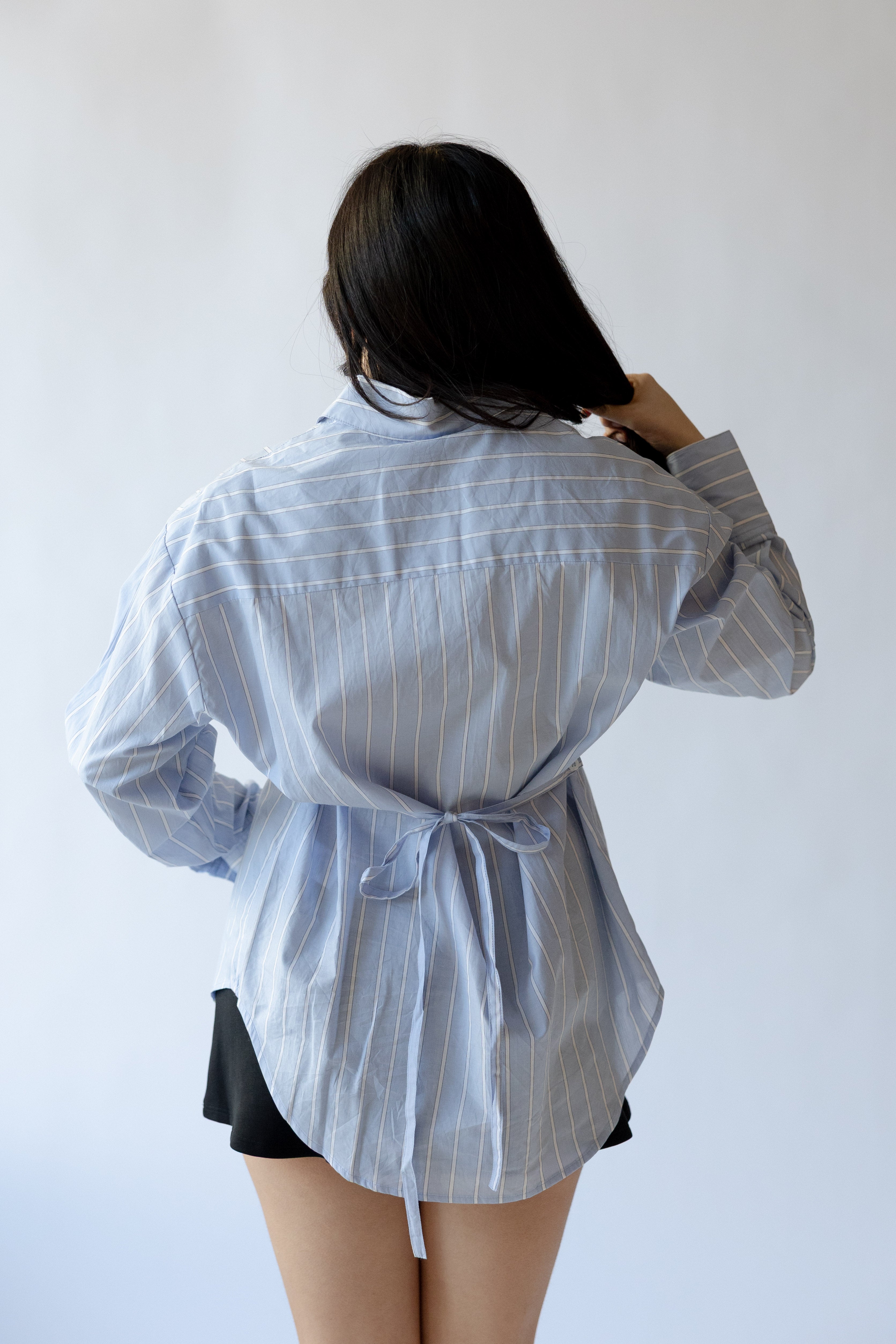Relaxed tailoring meets considered detail in the Serrano Shirt. Crafted in a crisp vertical stripe, this classic button-down is reimagined with an adjustable self-tie at the back waist—giving you the option to cinch the shape or wear it loose. The pointed collar and curved shirttail hem nod to menswear structure, while the fluid silhouette keeps things light.