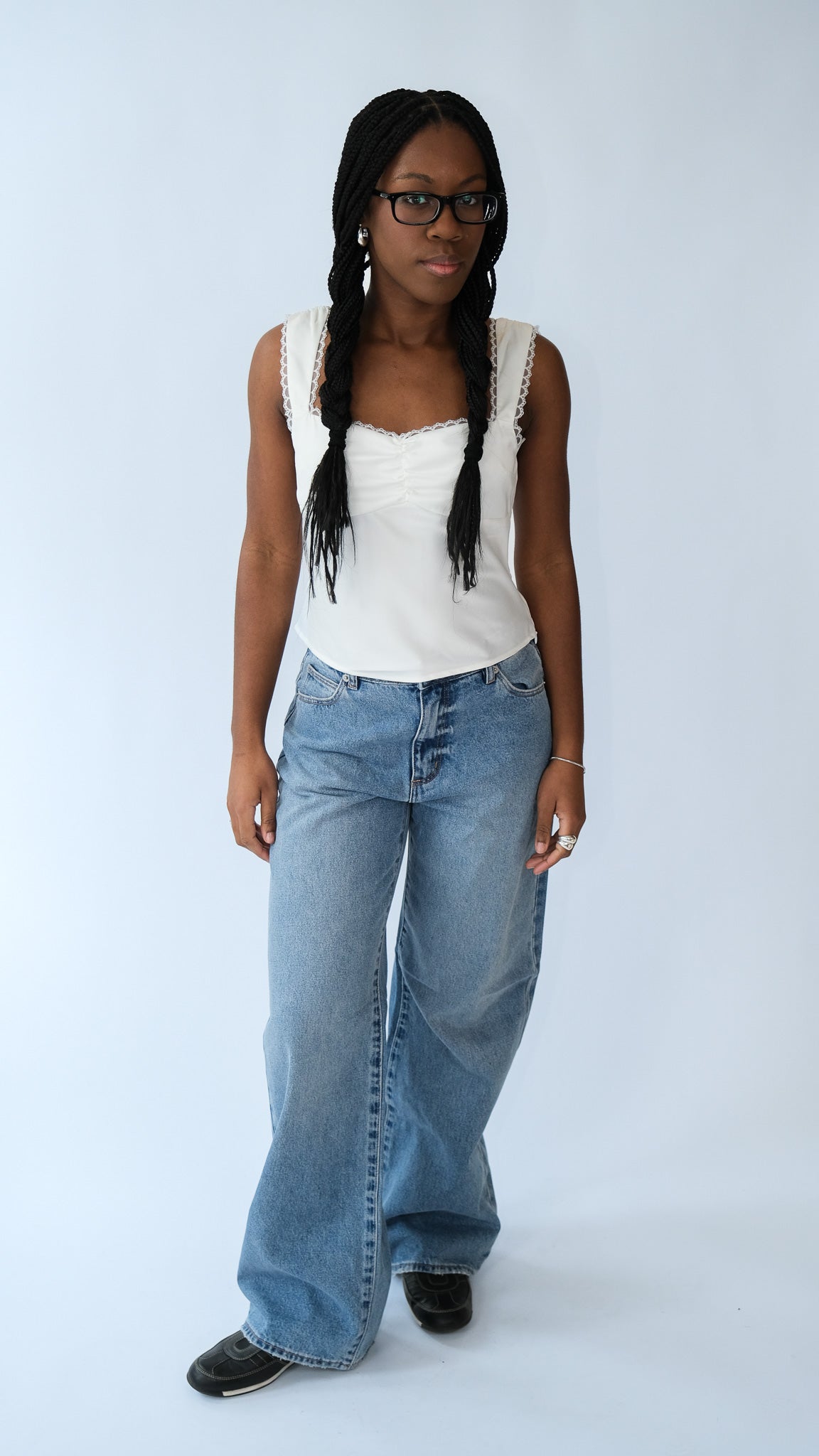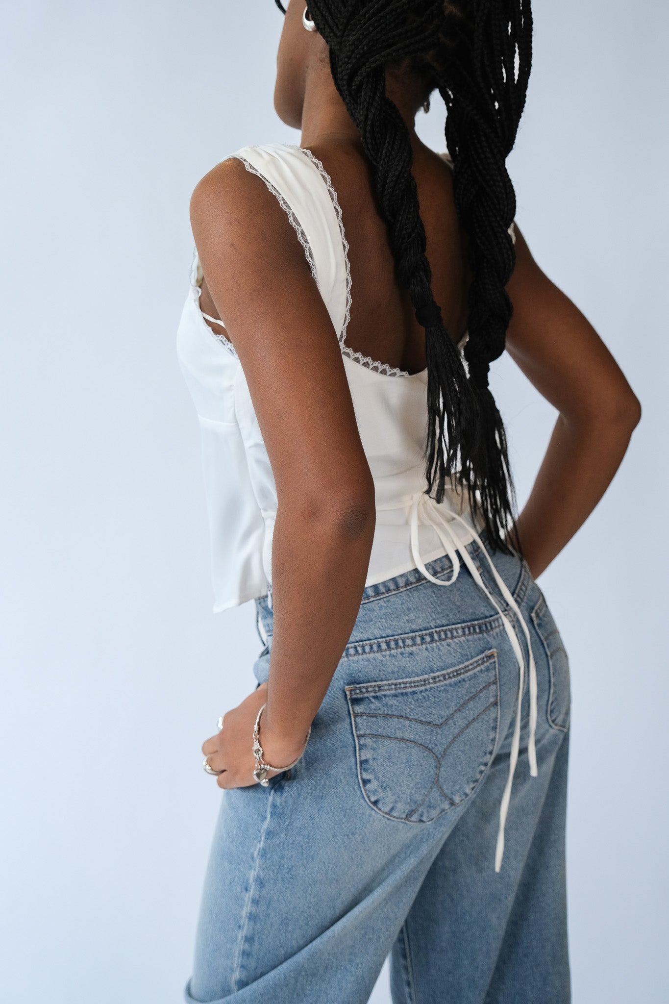 Romantic, delicate, and endlessly versatile. The Yolanda Top features a flattering ruched bust with dainty lace trim for a soft, feminine touch. Wide straps provide comfort and support, while the adjustable tie-back detail cinches the waist for the perfect fit. Whether dressed up or down, this top is effortlessly chic and undeniably charming.