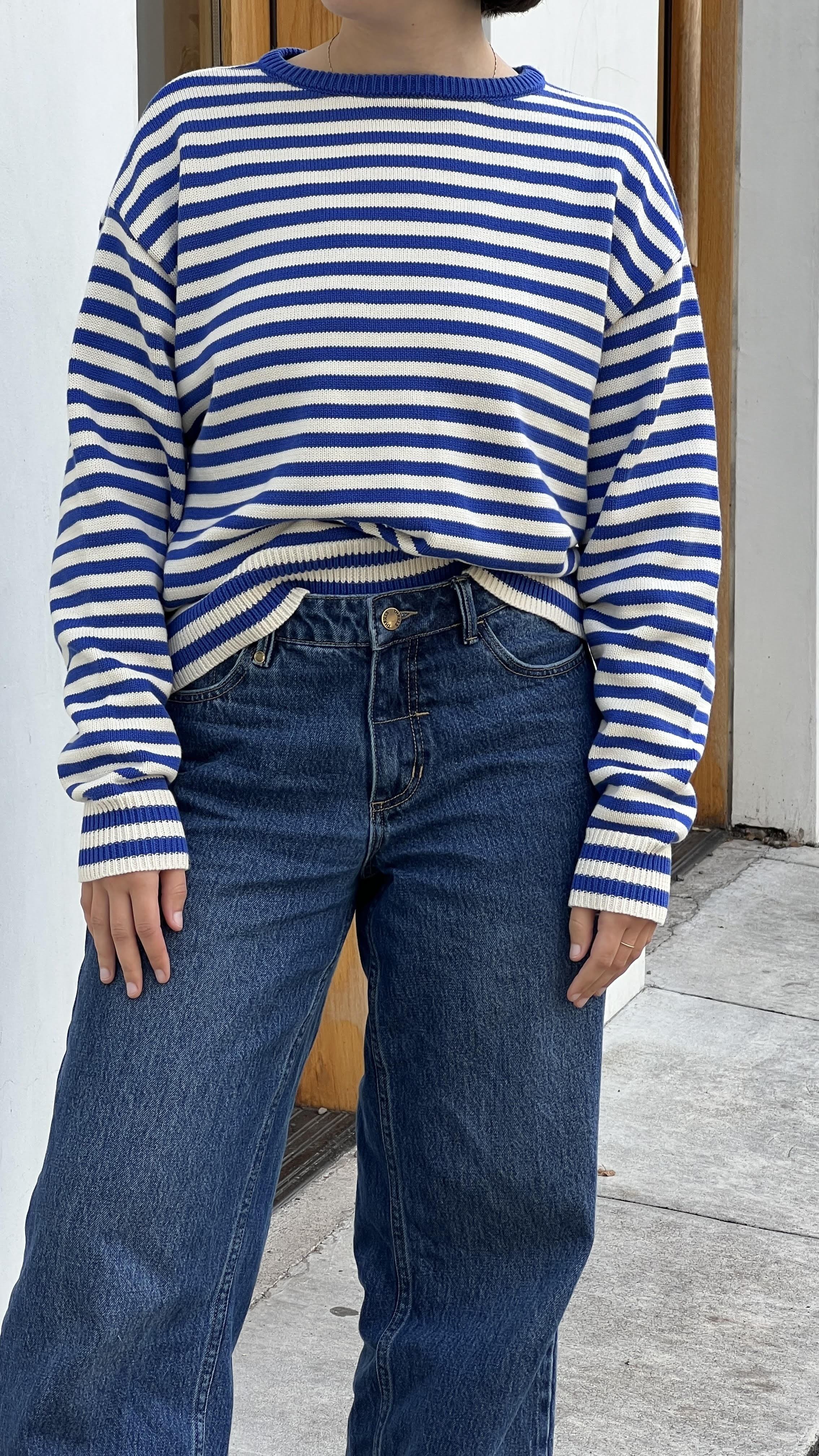 100% Organic Cotton, and 100% will be mistaken for a vintage sweater. In the perfect stolen-from-the-back-of-your-dad's-closet fit. Long sleeves, wide, boxy cut.