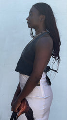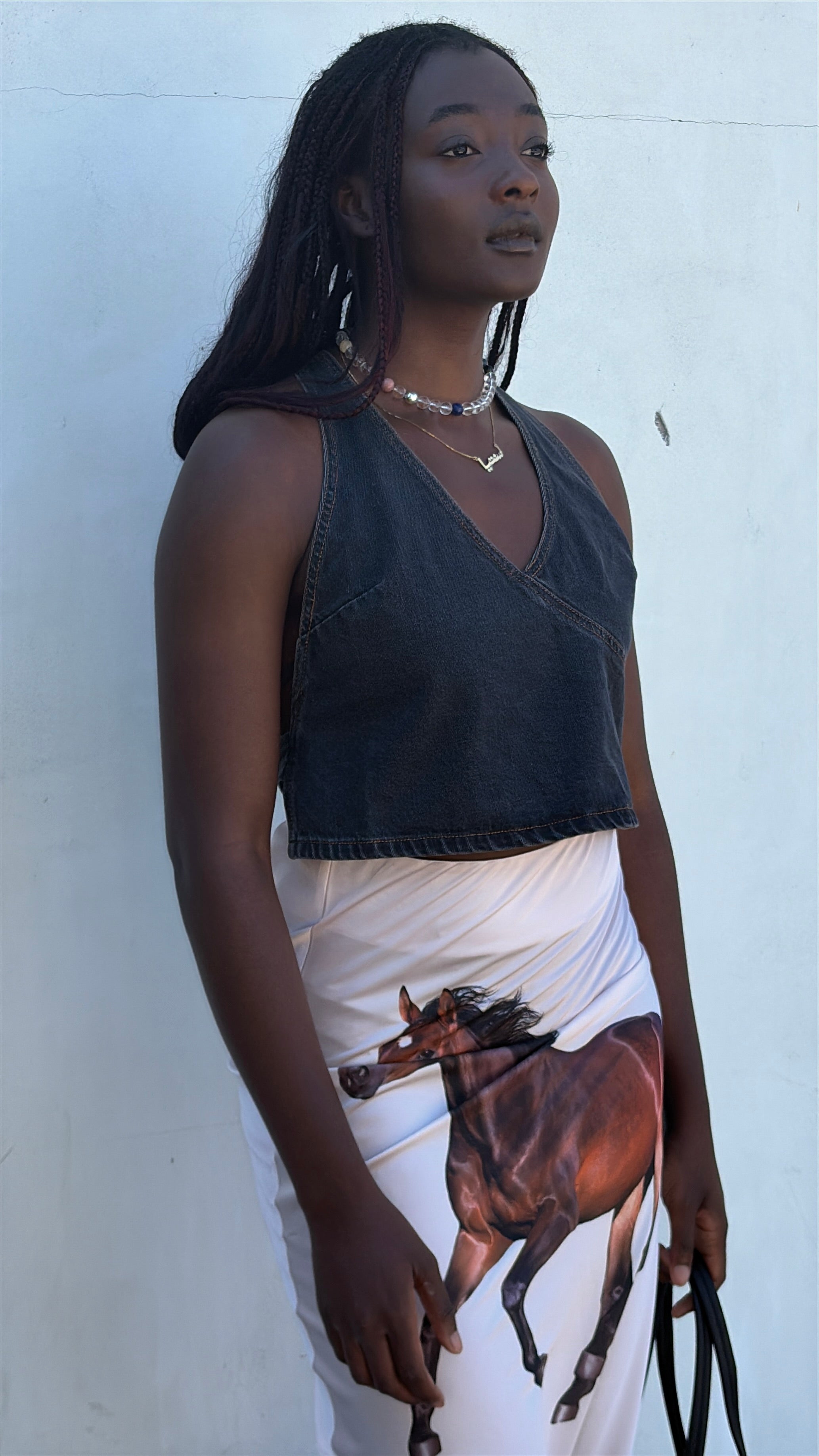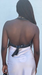 Black denim halter featuring a tie back. By Thrills.