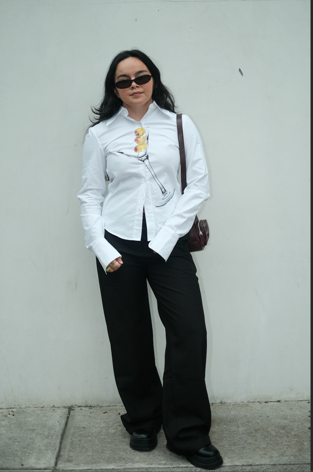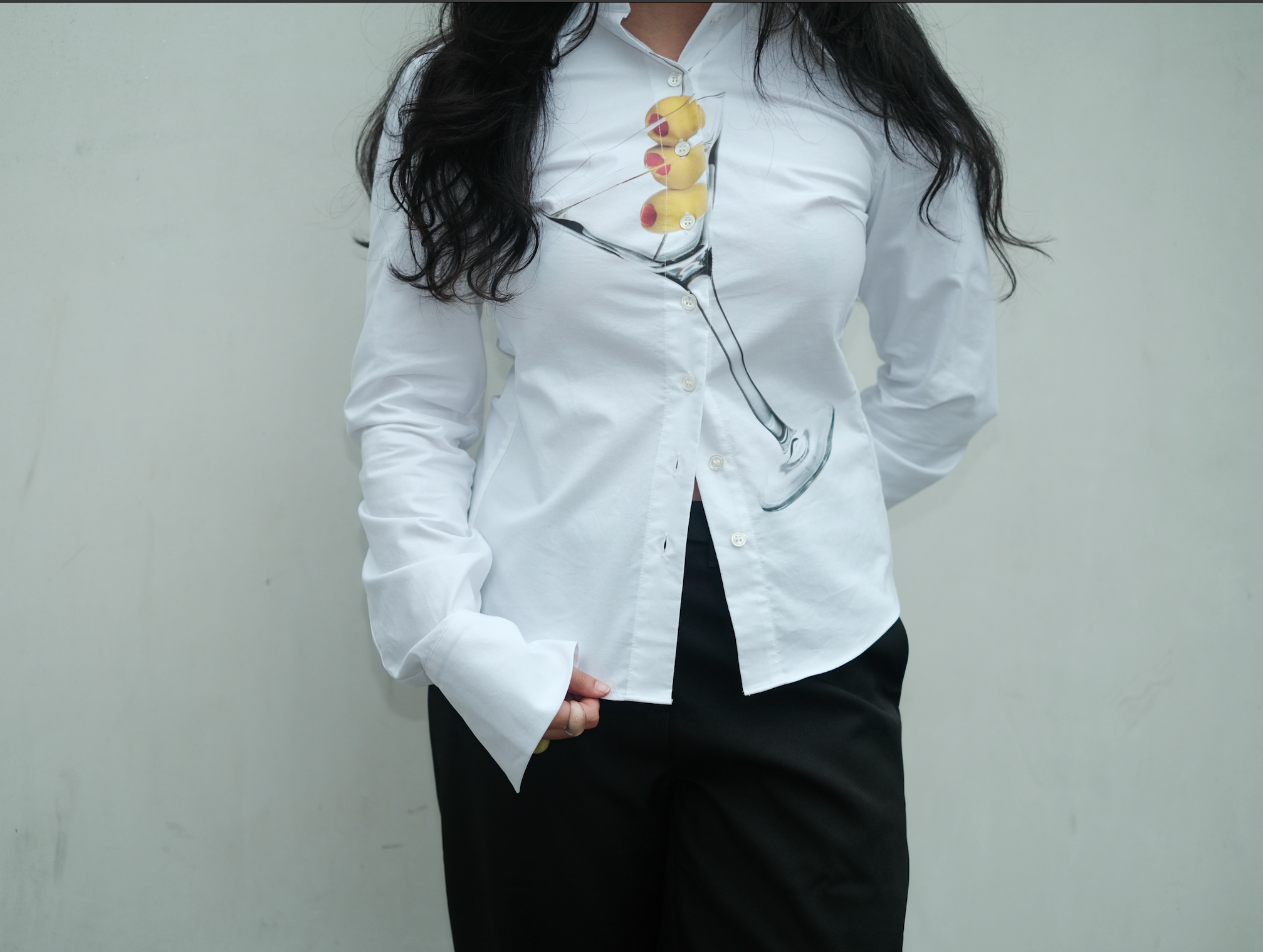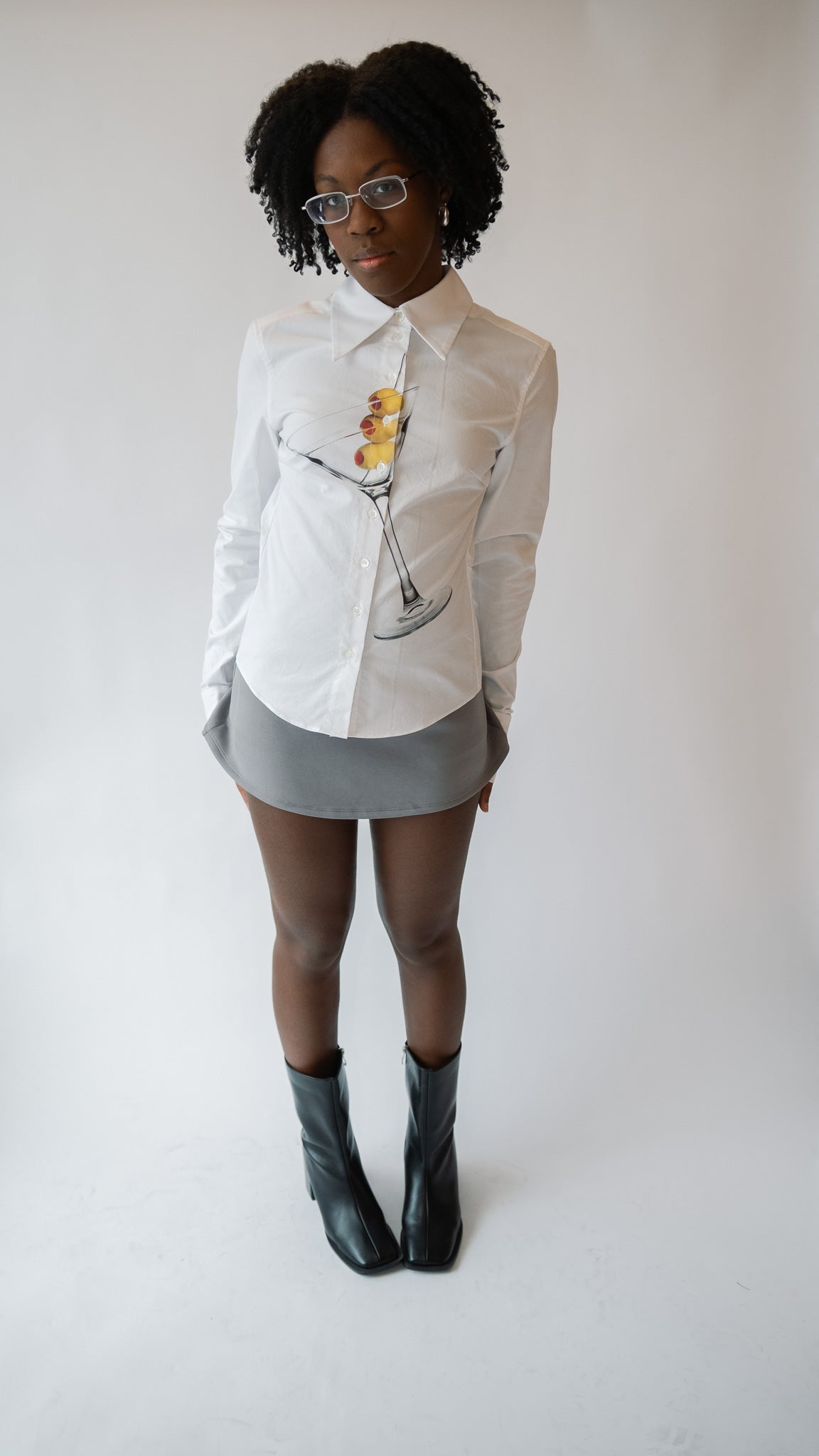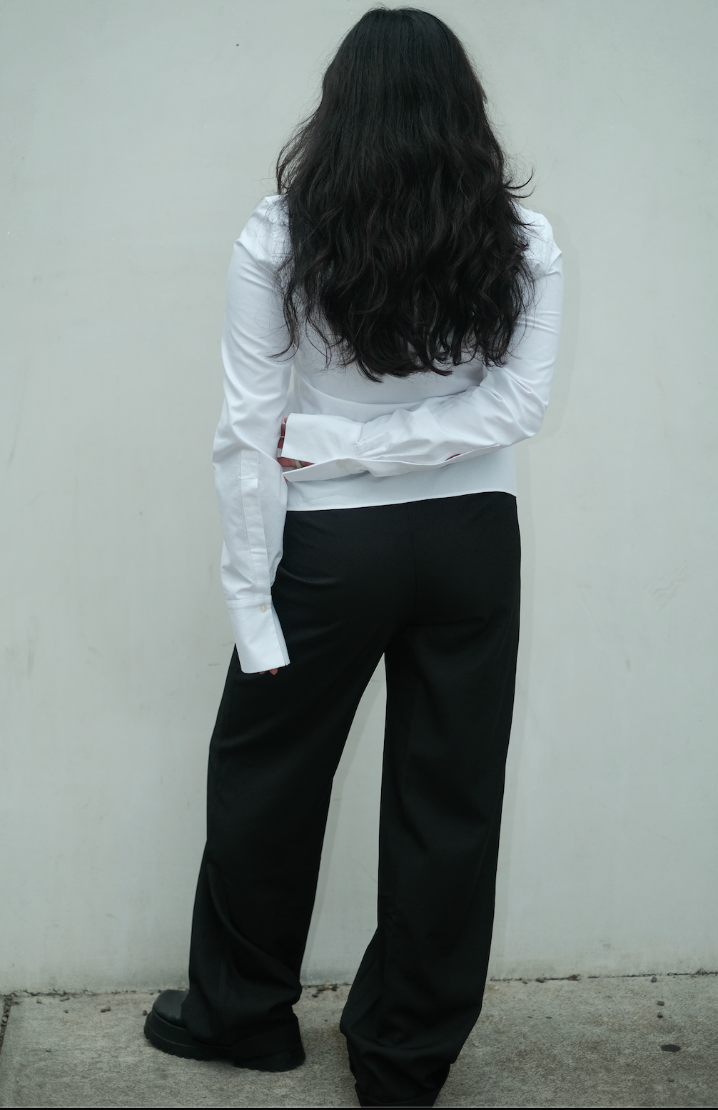 This top cuts tight to the body at the waist, with princess seams on either side of center and a cropped fit.
