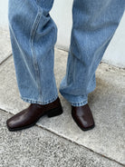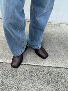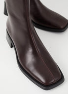 Blanca is the contemporary ankle boots with a minimal design. The style is crafted in dark brown leather featuring square toes, inside zippers and detailed seams along the upper. The thin outsoles sets on 47mm flared heels.
