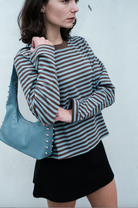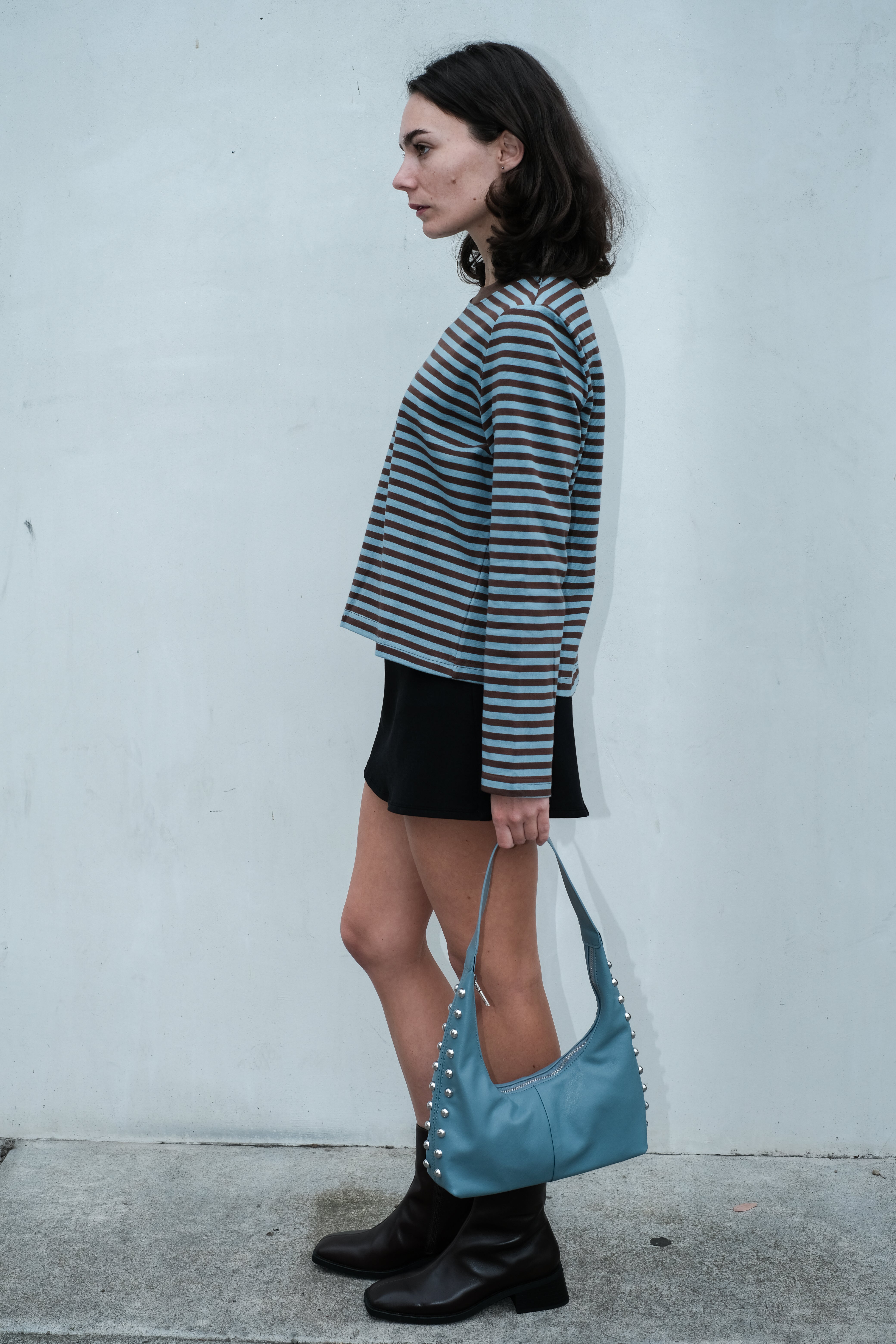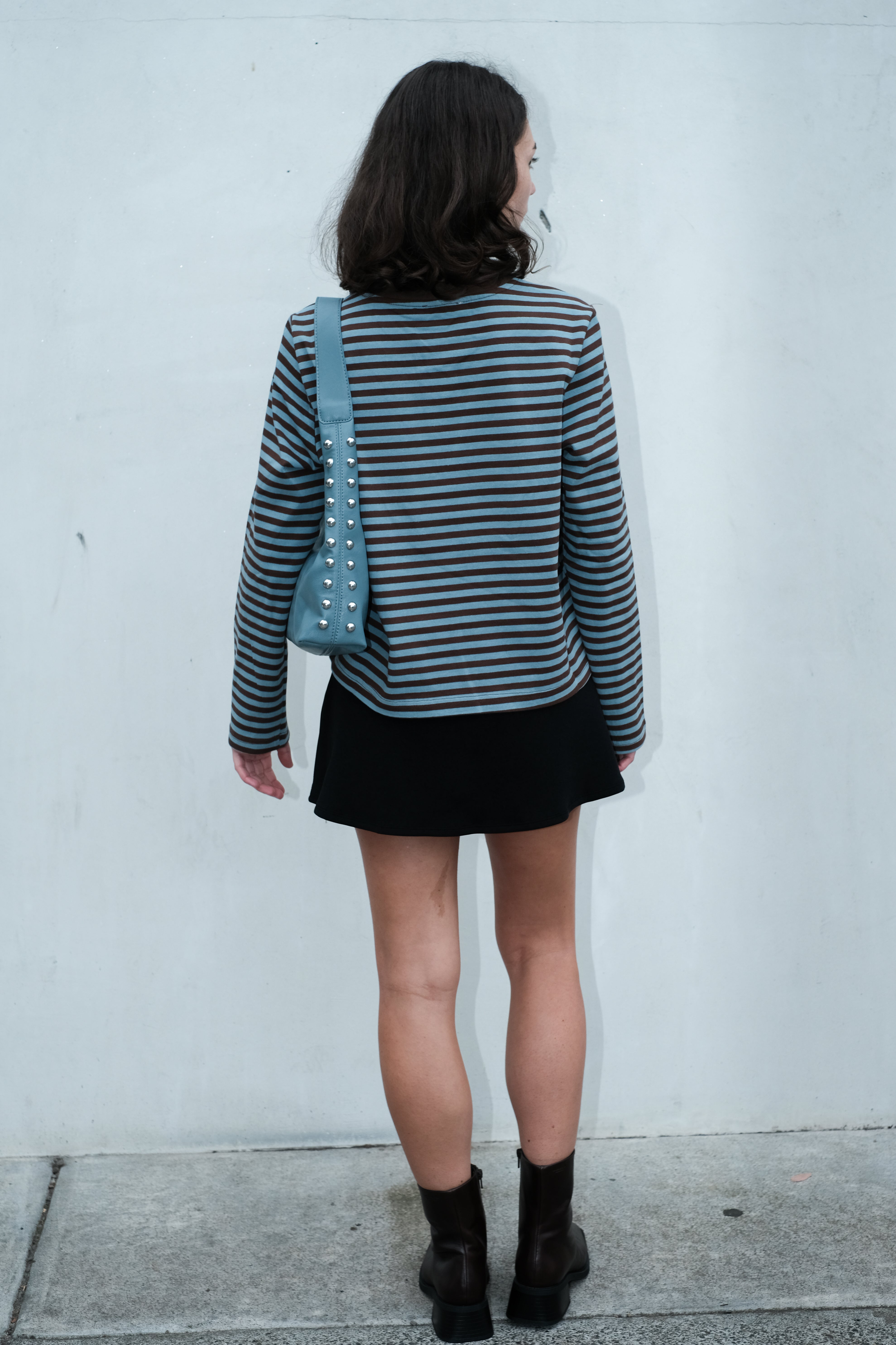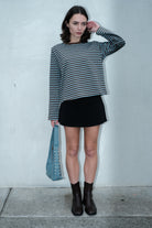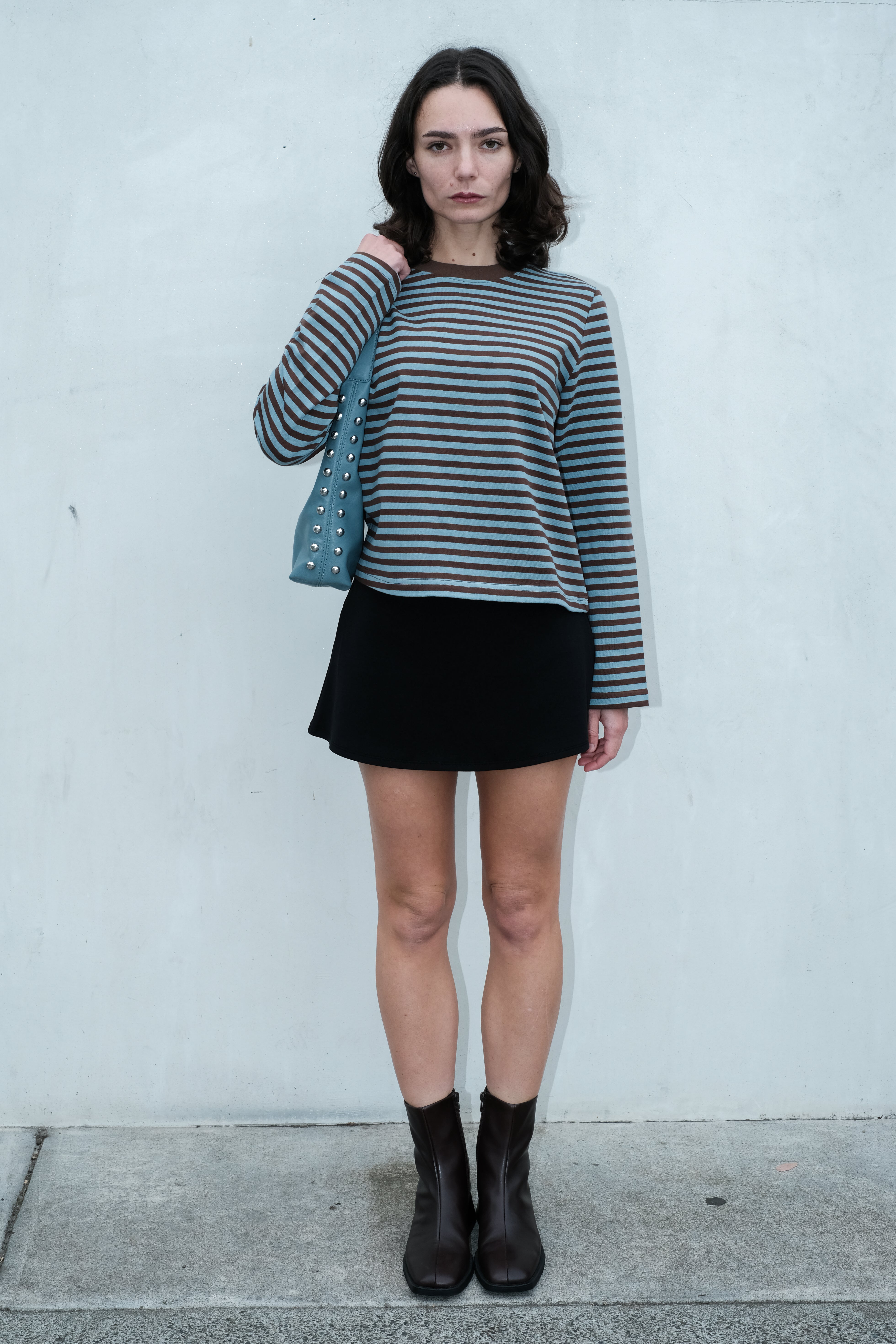 The Kathleen Top is a relaxed-fit long-sleeve shirt made from midweight striped fabric. It features a contrast color crewneck and long sleeves for a classic, casual look. Perfect for everyday wear with effortless style.