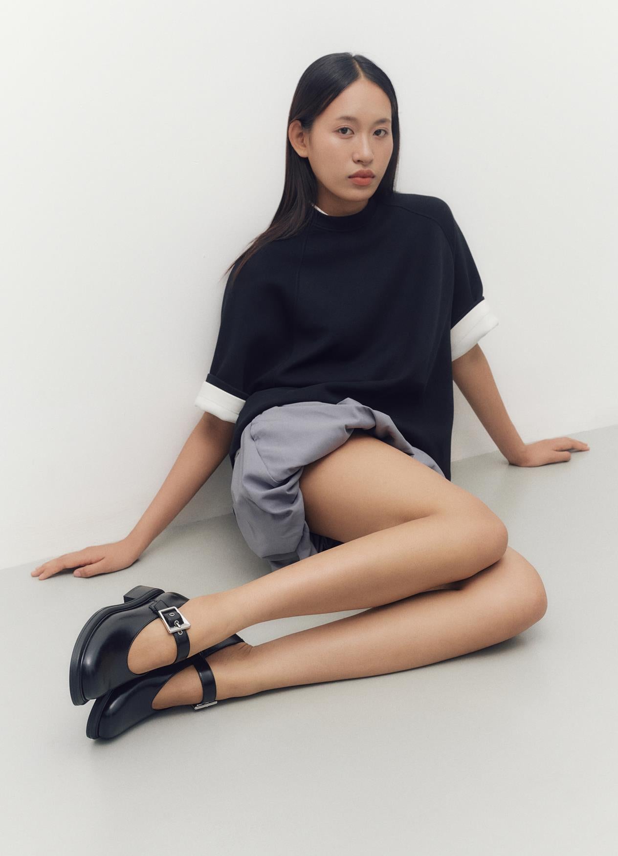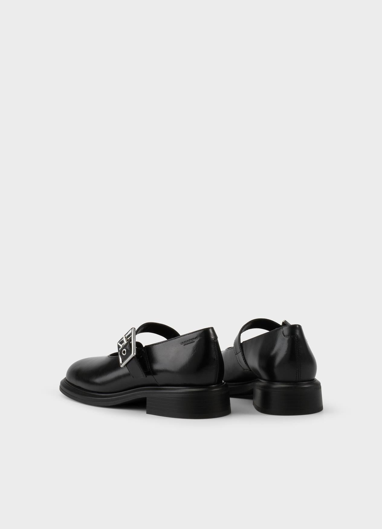 Contemporary Mary Janes with edge. Ellis is crafted from black leather and has a squared toe shape. Details include a lining and insole in chrome-free leather and an adjustable buckle strap.